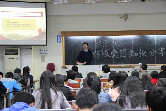 2014年12月30日下午,2014级党团知识分享会在我院B138顺利举办,辅导员以及学长学姐们与2014级本科生分享了党团的相关知识,同学们对此反响热烈。