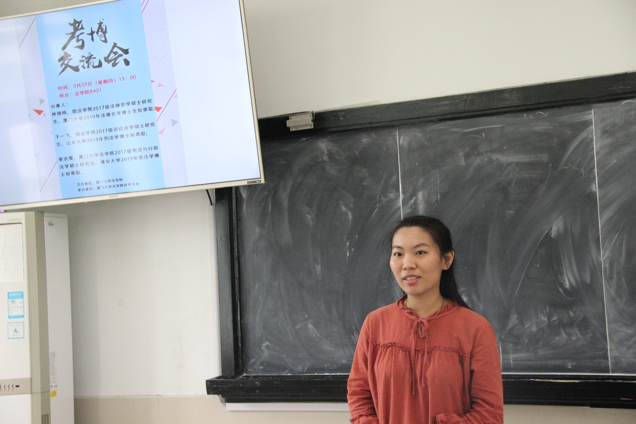 5月23日,法学院就业指导沙龙之考博交流会在法学院B422顺利举办。本次交流会邀请到现法学院厦门大学2019年法律史学拟录取博士生林晓炜、山东大学2019年刑法学拟录取博士生于一飞、清华大学2019年宪法学拟录取博士生李治莹作为本次交流会分享人,对攻读本校及外校博士的各方面为大家作分享。