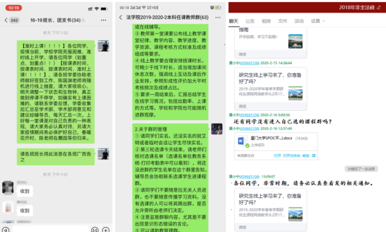 除未开课的课程外,所有课程均建立了课程群。学院教学秘书和辅导员协助任课教师通知选课学生入群。在17日开学之前,所有选课学生均已进入课程群。上课之前,辅导员再三强调上课秩序。学院上下通力合作,确保线上教学的开展。