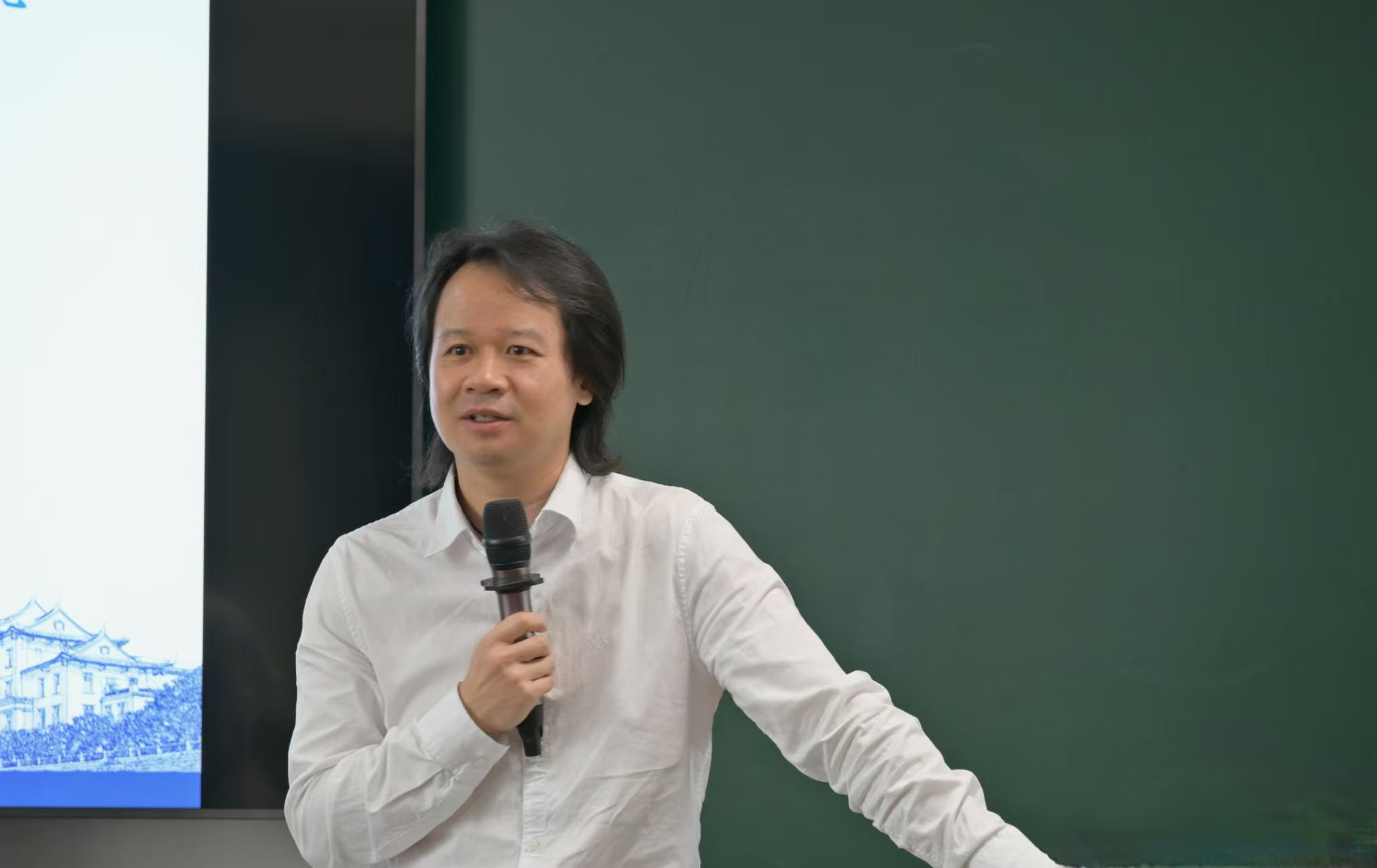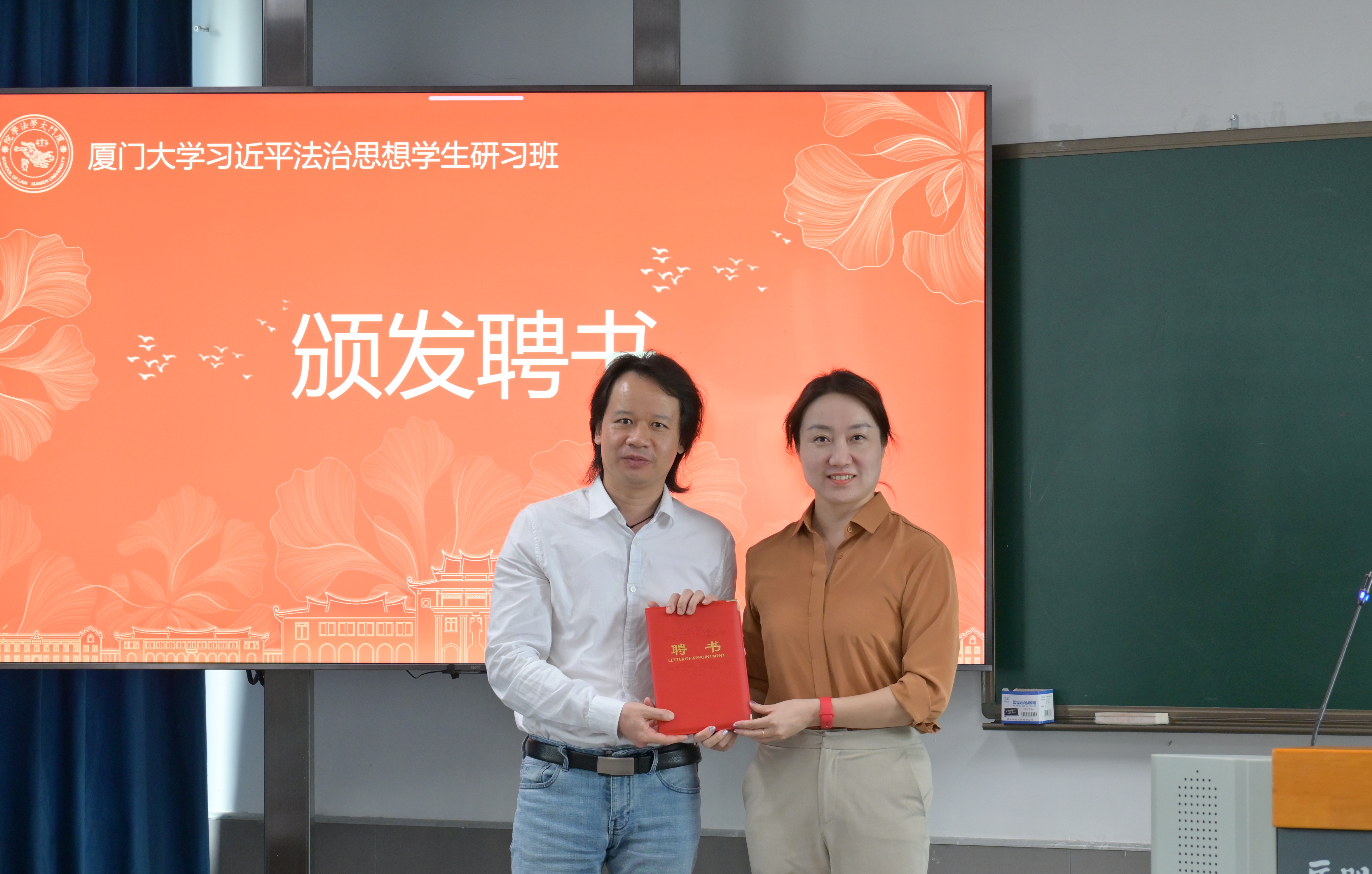 活动中,法学院党委副书记吴荻为周赟颁发授课教师聘书。