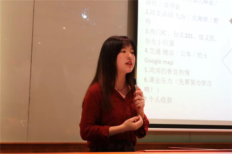 接着上台分享的是赴台湾大学交流的2016级本科生田瑞丽。她为大家展示了台湾大学独特有趣的宿舍活动,包括健身课、甜点课和集体出游等,以丰富同学们的课余生活。她还介绍了选课的流程以及如何通过加签的方式加课,并推荐了民法这一台大的强势学科。她还提到,虽然此前有过犹豫纠结,但最终她还是希望能够在不同环境中开阔视野、感受不一样的风土人情并决定前往台大交流,这一分享给了在场的同学们很大的鼓舞。