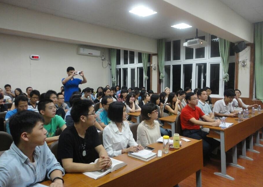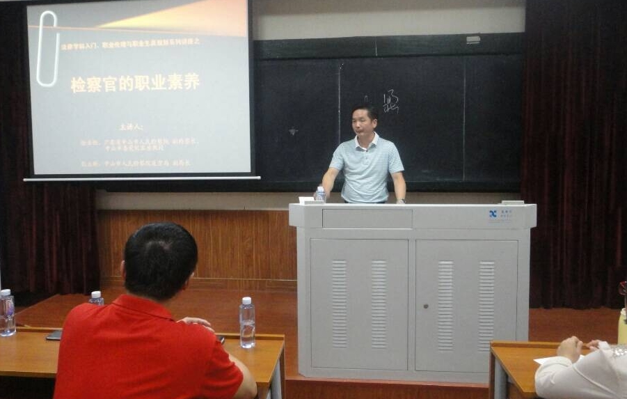 首先,徐业恒副检察长介绍了中山市和中山市检察院。接着,他就该主题从三方面发表演讲。一是检察院和检察官的角色定位。目前检察院正往“去地方化和去行政化”的方向发展,检察官正向“检察长—主任检察官—检察官”的方向改革。二是检察官与法官、政法委、纪委工作的不同。与法官相比,上下级检察院的关系为领导关系而非法院的指导关系,检察官的工作更具行政性和司法能动性;与纪委相比,办案时间受到限制,而且职权分配不同;政法委书记不应再由公安局长兼任。三是成为优秀的检察官需要怎样的素养。检察官需要良好的专业素养、人文素养和智慧素养。专业素养是指证据的审查把关能力、法律的适用能力、文书的写作能力、法庭的表达和应对、综合协调监督能力、职务犯罪的证据采集能力。人文素养包括坚守理想、敬畏心、人文关怀和明白事理。智慧素养包括政治智慧和人生智慧。另外成为一名优秀的检察官除了需要培养以上三种素养之外,阳光的心态和健康的体魄也是不可或缺的。接下来,彭立新局长为大家用生动的语言讲述了19年前批捕的案件、对公安机关违法违纪行为监督的案和反贪案件,从中归纳出成为优秀的检察官需要有使命感,需要不怕得罪人,还需要不放弃的精神。两位主讲人的演讲都结合亲身办案经历,内容充实,诙谐幽默,赢得同学们的阵阵掌声。
