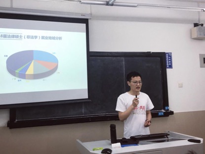 郑江文学长目前就职于上海通力律师事务所。学长首先向我们分析了目前各地的“抢人政策”,同时向我们介绍了上海的积分落户政策,大家根据自己的情况掐指一算,发现离在上海落户可能也就差了几个科研成果、几个荣誉称号、几个竞赛获奖吧,现场气氛突然变得有些紧张,大家不由得默默地握起小拳头告诉自己要好好努力了。选择了律师职业的江文师兄还向我们介绍了北上广深四地律所和律师的执业情况,更结合了自己在律师的所见所感,向我们传授了他在求职、工作中的十六字秘籍——踏实准备、认真严谨,重视英语,持续学习,也让我们知道了爱笑的人运气不会太差。