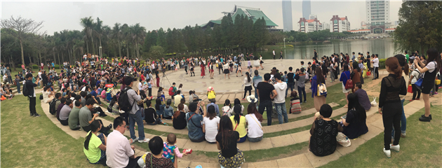 4月18日下午4时18分,音乐响起,伴随律动,两位女同学出现在芙蓉湖广场,和着音乐舞动起来。渐渐的,越来越多的同学进入大家的视线,他们聚集在一起,跟随着音乐,拍打着节奏,翩翩起舞。很快,快闪行动吸引了众多围观师生、游客,大家无一不受到欢快的旋律和同学们青春舞姿的感染,纷纷兴致勃勃地拍照,摄像,甚至跟着音乐一起摇摆。欢声笑语遍布整个广场。