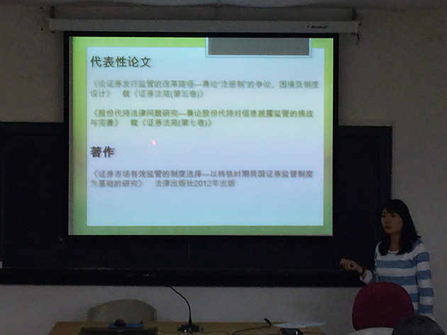 之后,黄意文同学对《我国证券市场信息披露制度的法律分析——以法律规范文义解释为基础的研究》一文进行赏析,其赏析路径与文思思同学大致相同,从作者简介出发,相继分析本文的论文结构、主题选定、论证方法与数据运用。黄意文同学认为本篇论文点出现行法令的不足,但欠缺具体改进及配套措施,应在资本市场自由化与投资者保护之间寻求平衡点。黄意文同学来自台湾,其对论文的赏析带有一丝独特之处,给大家带来新的启发。