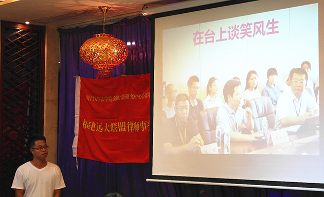 7时许,欢送晚宴拉开帷幕。伴随着鲜花与掌声,《凤凰花开的路口》悠扬奏响,满载记忆的摄影张张回放。那一天,我们加入金融法班这个温暖家庭;那一天,我们与远大律所结下不解之缘;那一天,是谁如此幸运喜博电脑归去;那一天,我们乘上奔腾的游艇破浪而行……那一天的过山车吓不到我们勇敢的心,那一天的烟波微茫沉醉了多少迷情,那一天的美食俘虏了谁的味蕾,那一天的登高呼唤了谁的希冀……我们还记得,那一个又一个的晚上,师兄师姐们不辞辛劳,为我们传道解惑;我们还记得,那数不清的日日夜夜中,我们朝夕与共,苦乐同舟……