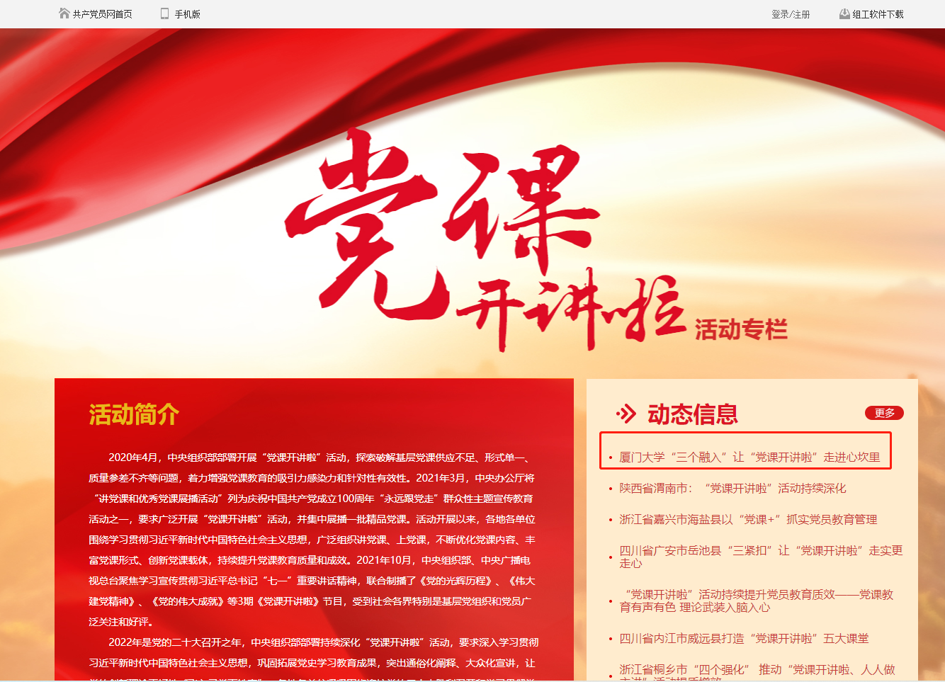 7月12日,中央组织部主管的共产党员网“党课开讲啦”活动专栏头条报道我院承办的厦门大学“党课开讲啦”微党课大赛。报道以《厦门大学“三个融入”让“党课开讲啦”走进心坎里》为题,评价“党课开讲啦”融入新思想,让党课入脑入心,融入新形式,让党课出彩出新,融入新内涵,让党课走深走实。