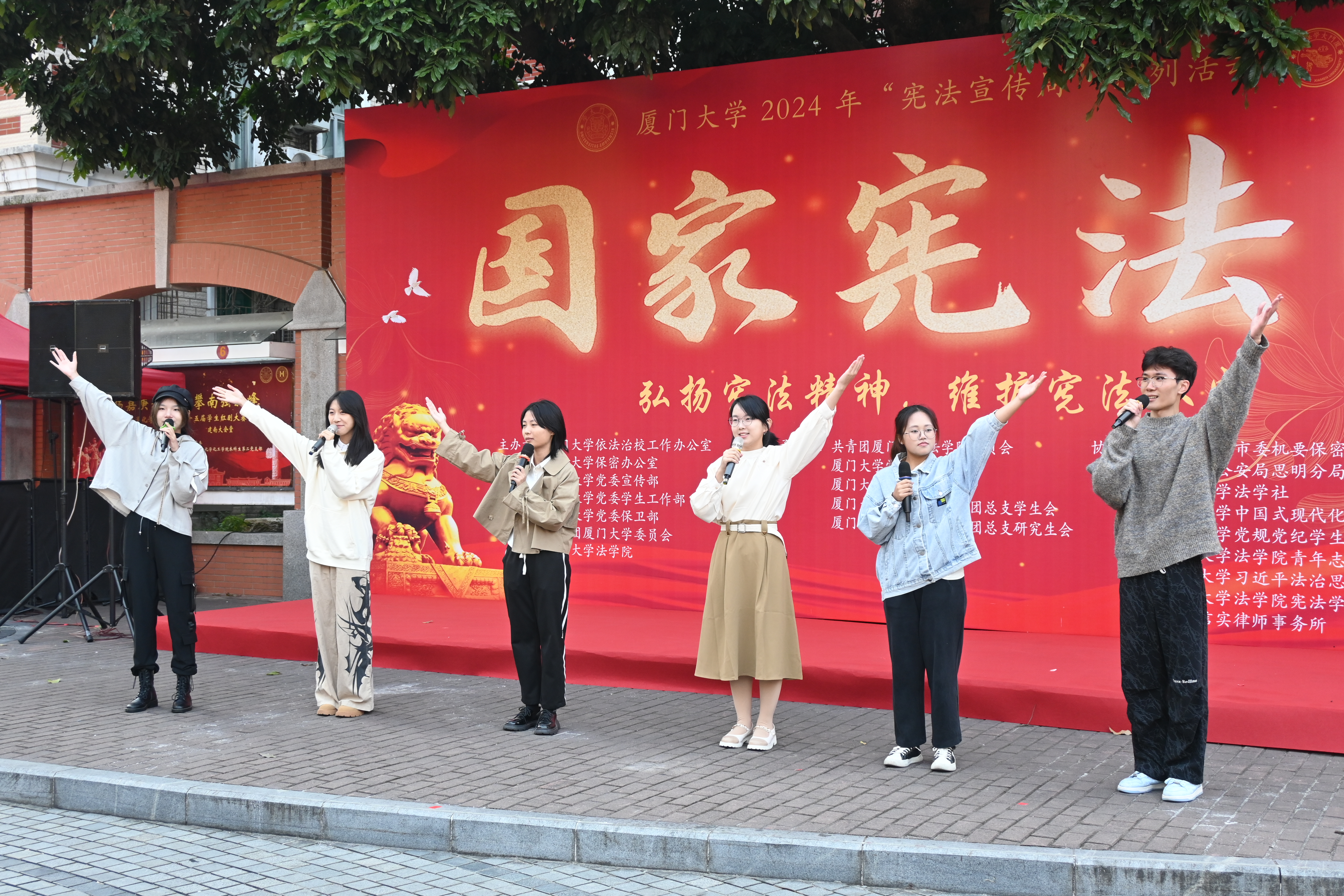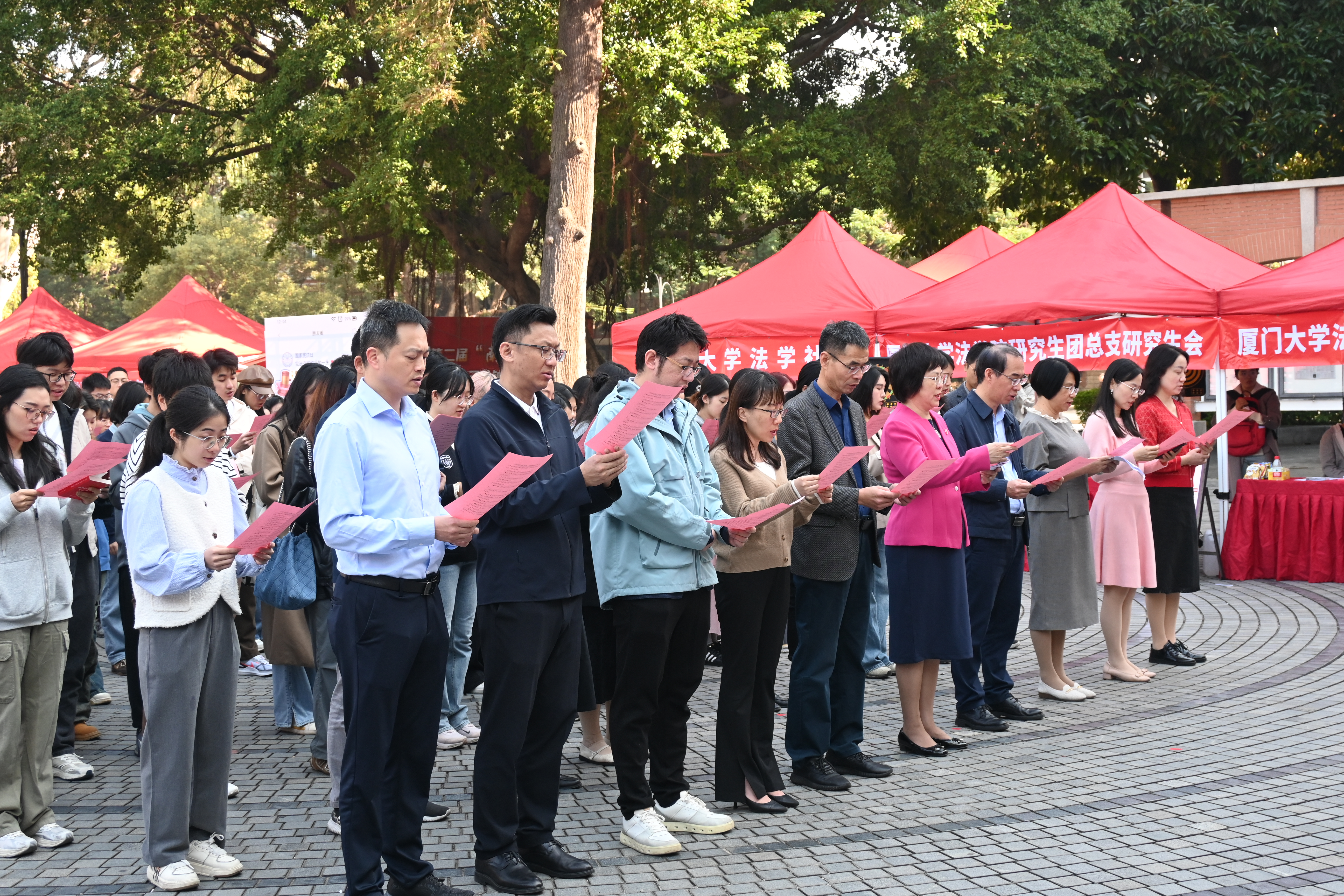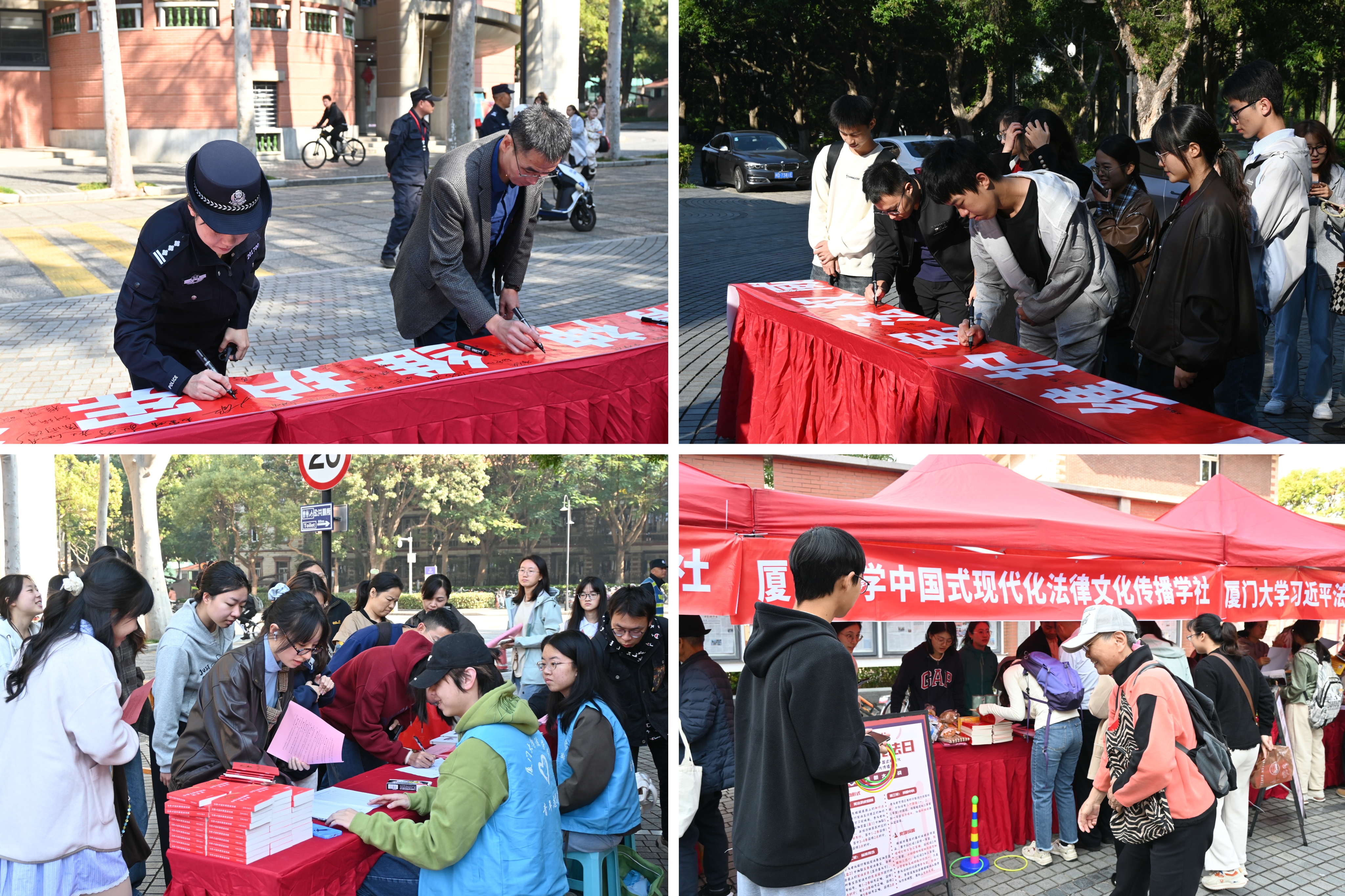 现场举办了路演活动。由学生会、研究生会、习近平法治思想研习班、法律文化传播学社等学生组织和社团精心设计的宪法主题游戏吸引了师生的热情参与。厦门市委机要保密局、厦门市公安局思明分局大学路派出所等在现场开展保密、反诈宣传,福建信实律师事务所为师生提供法律咨询服务和普法宣传。现场还设有“弘扬宪法精神 维护宪法权威”主题横幅签名,向师生发放《中华人民共和国宪法》《中华人民共和国民法典》。