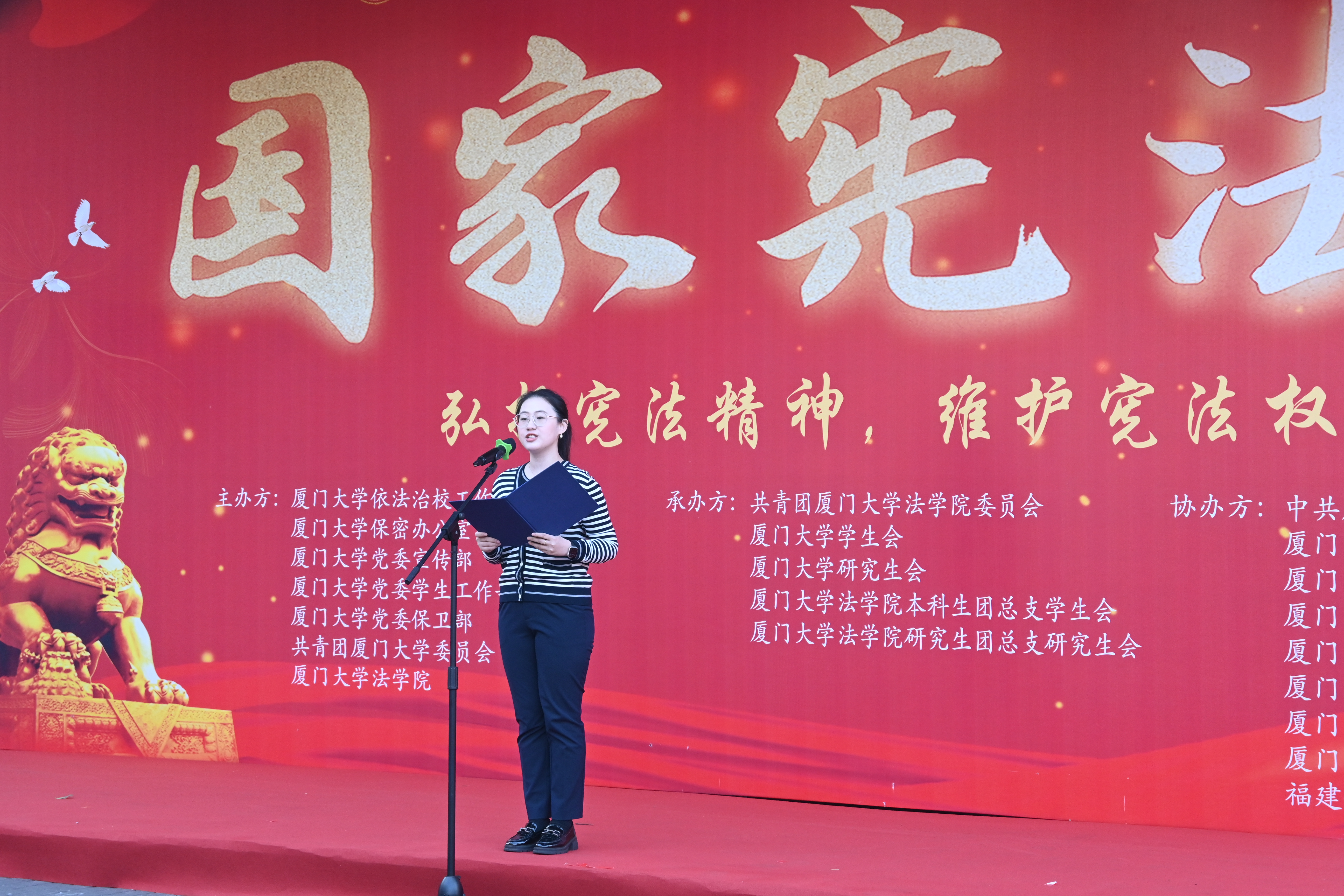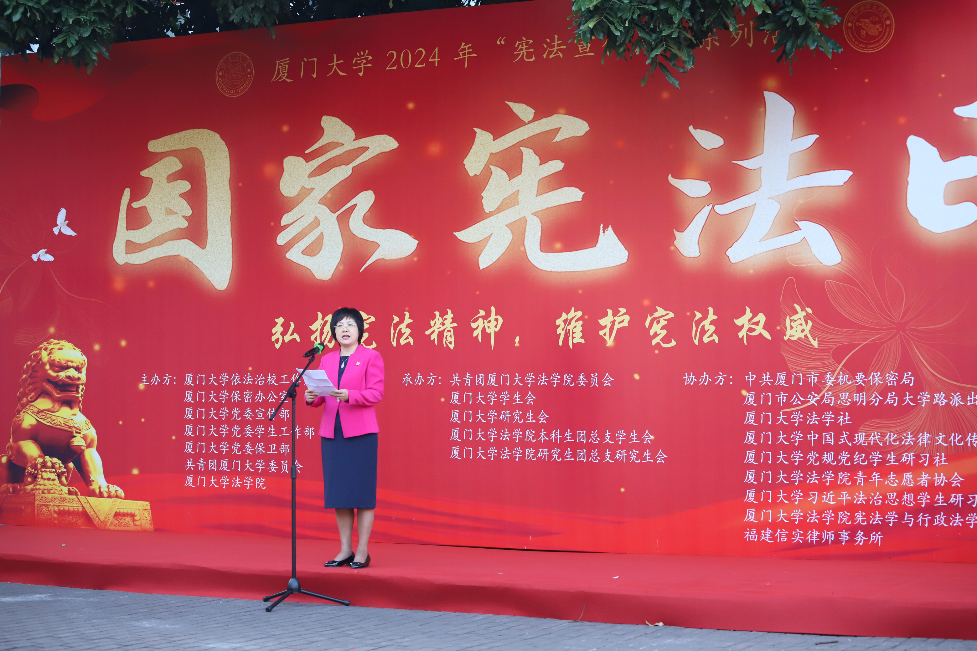 为深入学习贯彻党的二十大精神和二十届二中、三中全会精神以及习近平法治思想,加强宪法宣传教育,大力弘扬宪法精神,在第十一个国家宪法日即将到来之际,2024年12月2日上午,厦门大学举行2024年国家宪法日主题宣传教育活动。厦门大学副校长邓朝晖,厦门市委机要保密局副局长洪辉鹏,校党委保卫部部长徐跃进,法学院院长陈鹏,依法治校工作办公室、保密办公室、纪检监察机构、学生工作部、校团委等有关人员出席本次活动。活动由法学院党委书记何丽新主持。