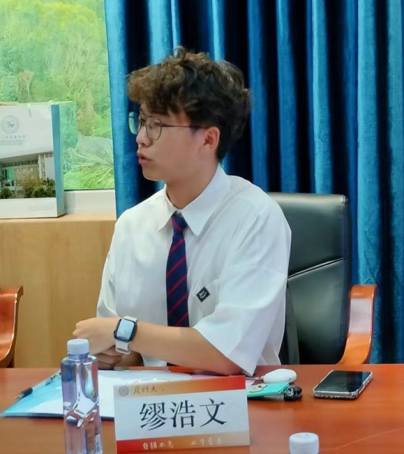 学生代表缪浩文发言。他首先与大家一同回忆了“国际化班”项目修读三载的宝贵光阴,对学院和老师的辛勤培养表达了诚挚的感谢。接着分别从涉外法治学习的初心与设想、感受与体验两个角度分享了自己修读国际化班的所感所想,并结合自己成功申请英国曼彻斯特大学法学院的经验,从申请者的角度表达了对国际化班项目发展的期待与展望。参会的同学也都结合自己的经历与体验,分别交流了自己修读“国际化班”项目的收获与体验,并从人员遴选、课程设置、考核方式、实习实训等方面,对该项目的发展提出了有价值的建设性意见,祝愿“国际化班”越办越好。