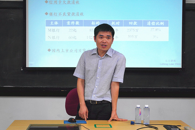2016年5月27日晚7点,由厦门大学法学院金融法研究中心和福建远大联盟律师事务所联合主办的“厦门大学‘远大’金融法高端论坛”系列讲座之“应收账款催收法律实务”在我院B520教室如期举行。应厦门大学法学院金融法研究中心主任刘志云教授的邀请,福建乐丰律师事务所主任林建章律师担任本次讲座的主讲人,厦门大学法学院经济法教研室阳建勋老师主持了本次讲座,讲座现场座无虚席。林律师结合其从事律师行业十余年积累的经验娓娓而谈,为同学们带来一场从点到面、面面俱到的讲座。