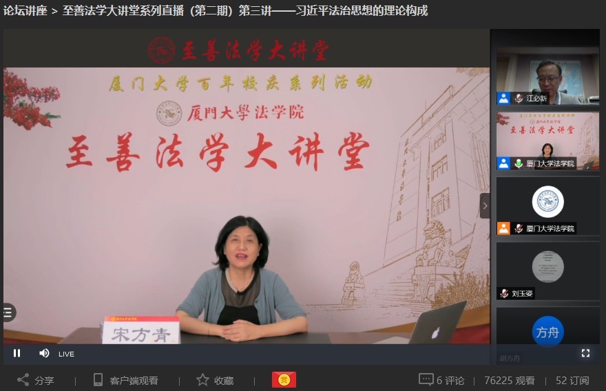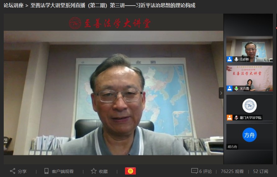 中国共产党第十九次全国代表大会代表、第十三届全国人大代表、第十三届全国人民代表大会宪法和法律委员会副主任委员、中国法学会副会长江必新教授做客厦门大学法学院至善法学大讲堂(第二期),主讲《习近平法治思想的理论构成》,讲座由厦门大学法学院院长宋方青教授主持。