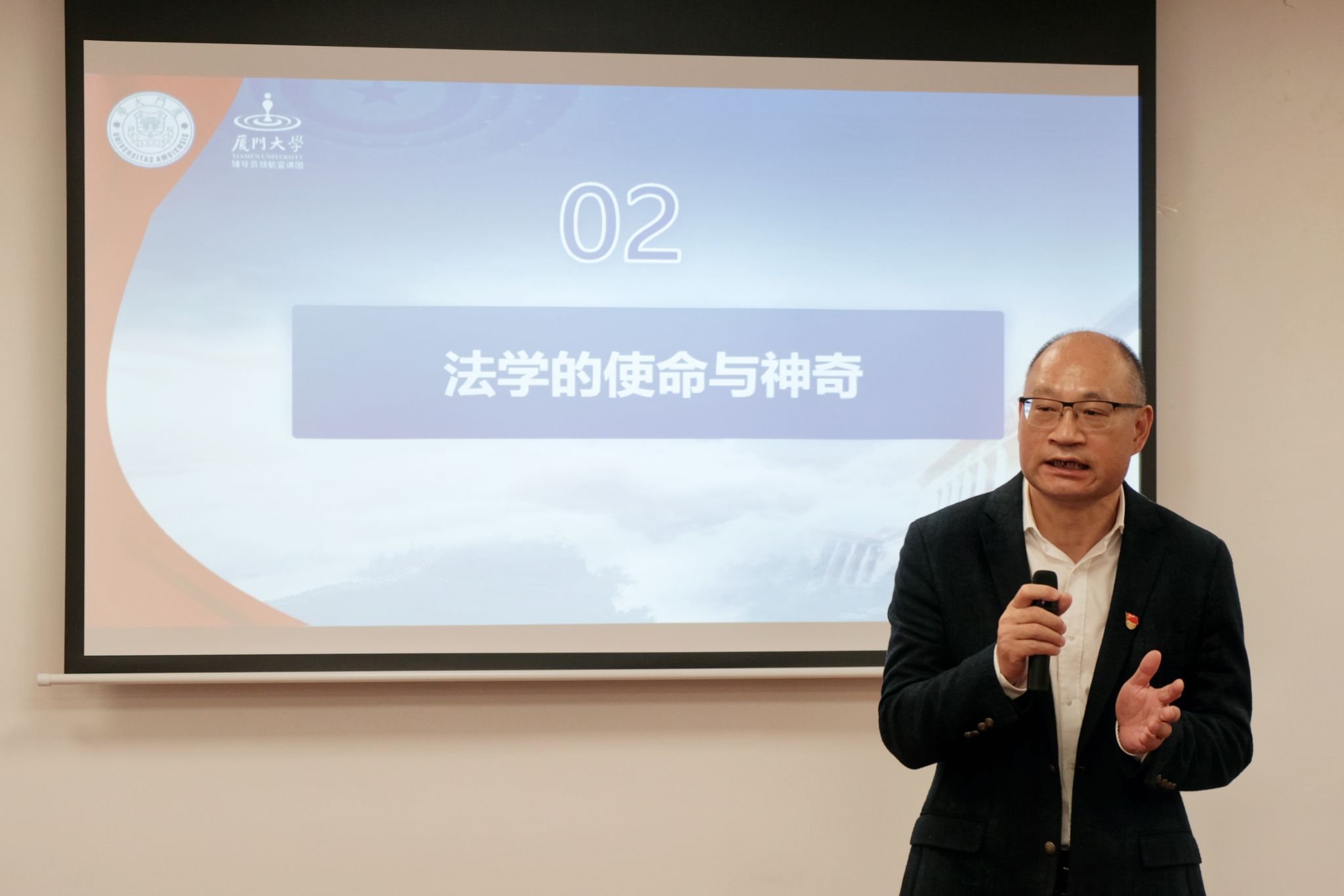 4月3日下午,由学生工作部主办、法学院承办的“高举伟大旗帜 争做时代新人”厦门大学学习贯彻党的二十大精神辅导员领航宣讲活动第二期在思明校区南光5三楼会议室举办。厦门大学党委副书记徐进功,法学院党委书记许和山,学生工作部副部长许美霞、陈泗林,法学院党委副书记吴荻,法学院教授郑金雄,以及思明校区学院辅导员代表和学生代表出席活动。本期活动主题为“依法治国”,由法学院团委书记、辅导员刘茜主讲、主持,并以线上线下相结合的方式,邀请专业教师、校外嘉宾、学生代表共同分享他们眼中的“依法治国”。