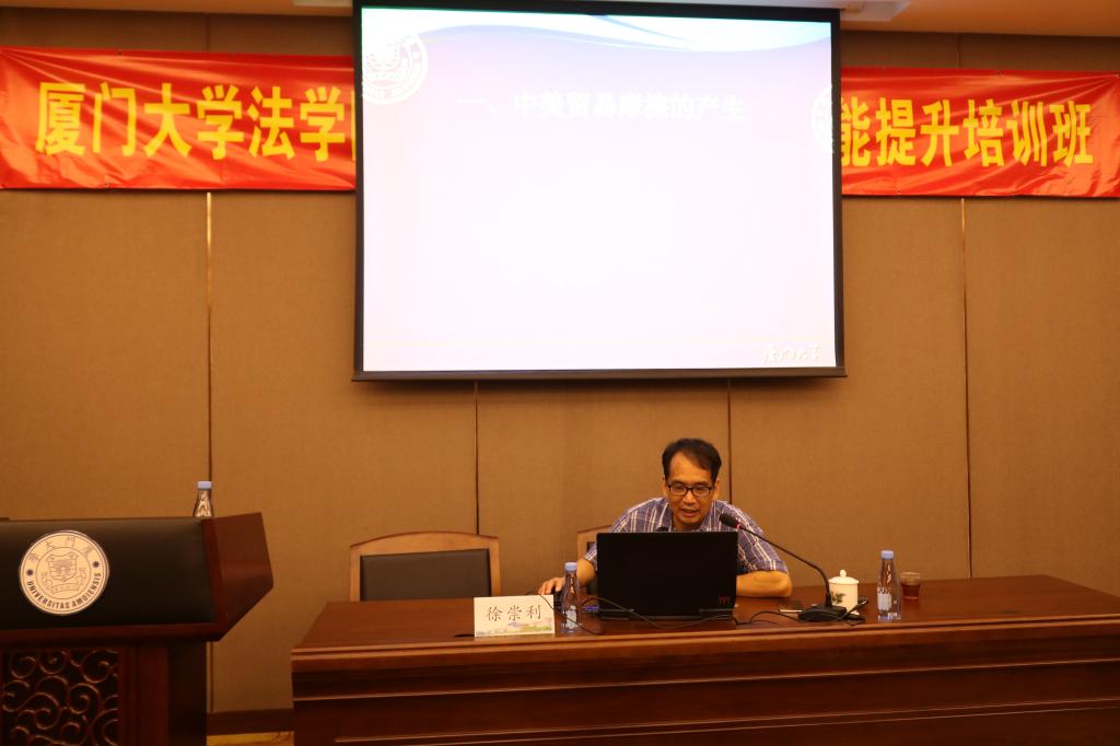 8日上午,法学院前院长、著名国际经济法专家徐崇利教授为学员们做了题为《中美贸易摩擦的来龙去脉》的专题讲座。徐教授聚焦于当前国际形势的关键点,从中美贸易摩擦的产生、应对以及趋势三个方面来进行阐述。徐教授分析中美贸易摩擦的表现,指出中国经济发展对美国霸权的威胁使美国对中国的定位改变、对华政策调整,是贸易战产生的原因。中美贸易摩擦实质是中美之间经济体制的较量,中国的应对战略是维持中美间“斗而不破”,致力于缓解中美冲突。面对美国的无理要求,中国的策略从“克制”转变为“斗争”。从当前的局势来看,徐教授预见中美贸易摩擦将有长期化、复杂化的趋势。徐教授声情并茂,环环紧扣,用深入浅出、清晰易懂的方式,为法学院行政人员带来一场别开生面的学术盛宴。听完讲座,不少学员意犹未尽,继续向徐教授探讨请教。