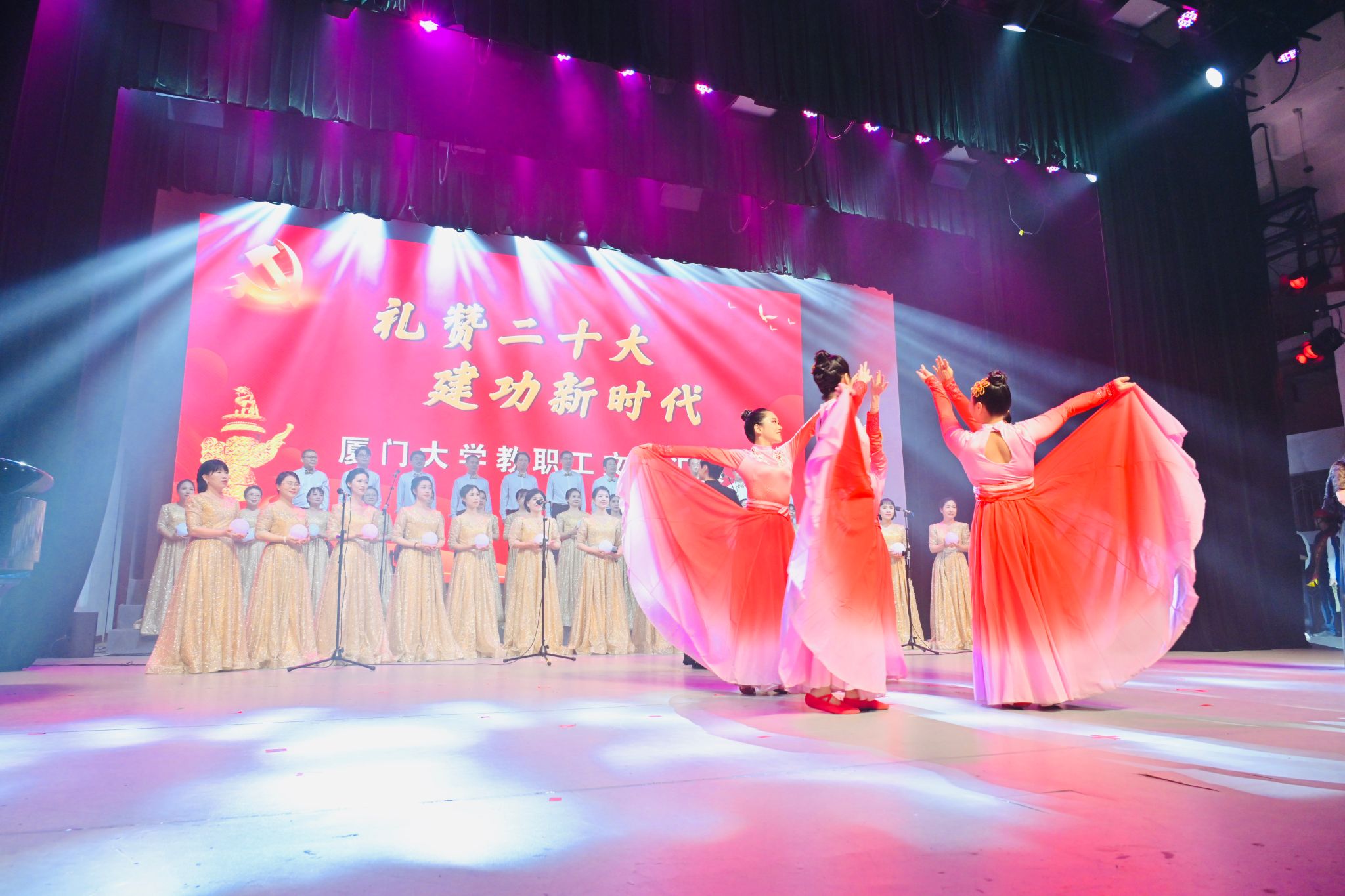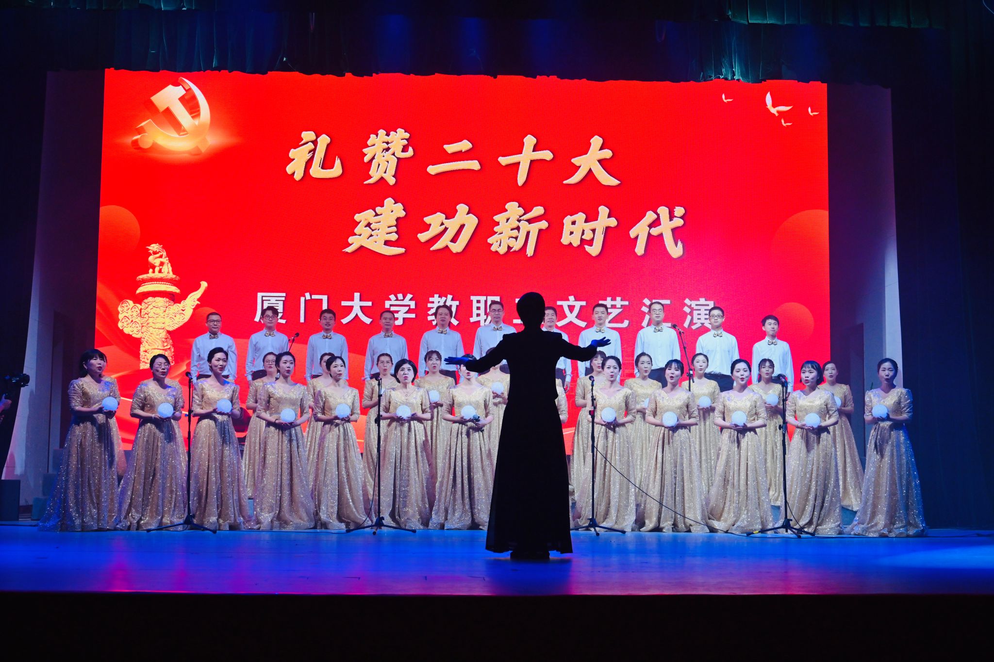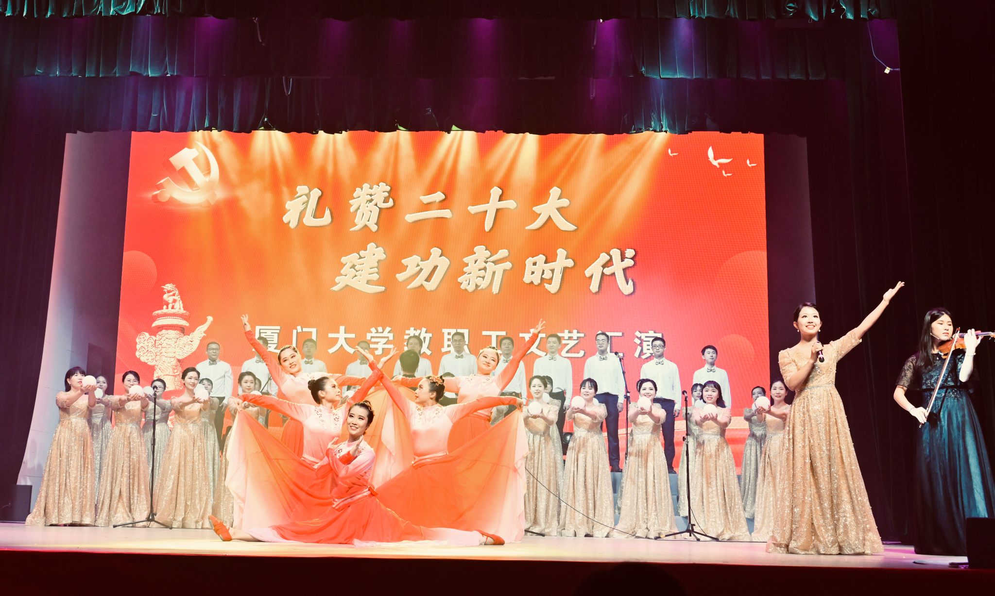 “礼赞二十大 建功新时代”厦门大学教职工文艺汇演由厦门大学工会主办,旨在庆祝党的二十大胜利召开,引导广大教职工掀起学习宣传贯彻党的二十大精神热潮,团结动员广大教职工为全面建设社会主义现代化国家、全面推进中华民族伟大复兴而努力奋斗!