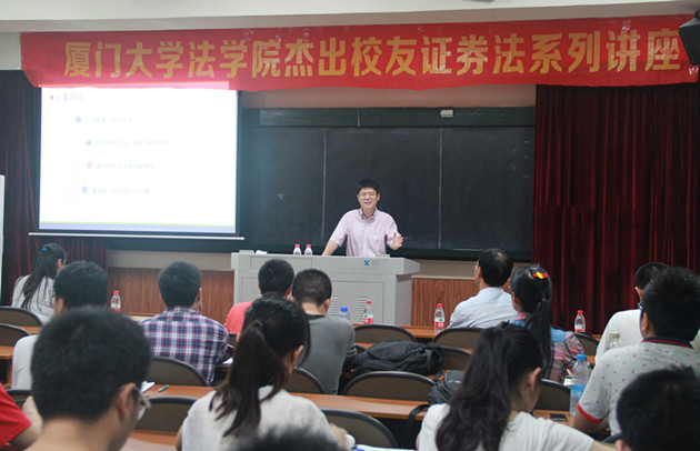 7月25日19:00,由厦门大学法学院主办、法学院研究生会承办的法学院杰出校友证券法系列讲座第五场在A302教室隆重开讲。本场讲座由厦门大学法学院2001级国际法专业博士程红星担任主讲。程红星博士 2004年至2006年在深圳证券交易所从事博士后研究,期间参与了2006年《证券法》、《公司法》修订工作。2006年10月,加入中国金融期货交易所,参与了沪深300股指期货、5年期国债期货等新产品的研发工作。此外,程红星博士还深入参与期货市场的相关立法工作,如《期货交易管理条例》及其配套规章的制定、《期货法》立法工作等。法学院党委副书记郭锦星老师出席讲座并担任主持,在讲座开场致辞中,对程红星博士的到来表示了诚挚的感谢和热烈的欢迎。