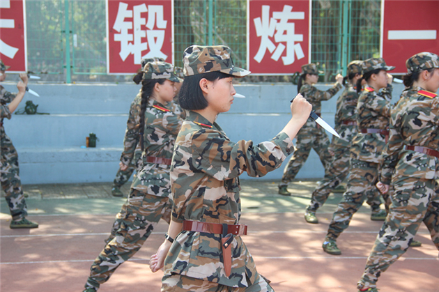 匕首操方阵可谓是特殊方阵中一抹亮丽的风景线,分为弓步上刺、马步侧刺、闪身反刺、上步斜刺、转身后刺、上防侧刺、换刀下刺、绊脚下刺等招式。都说“巾帼不让须眉”,女同学们将军人的柔与刚完美地糅合在匕首操的一招一式中,刚硬中不失柔软,优美中不失气度。
