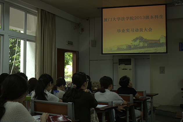 2016年6月17日下午,2013级本科生毕业实习动员大会在B138举行。法学院党委副书记周蕾、团委书记高斌、教学秘书陈丽清出席了本次会议,实习带队老师郭春镇、陈帮锋 、吴旭阳 、陆而启、陈喜峰、王宗涛、吕英杰、刘志云、陈鹏、张膑心、齐云也出席了本次会议。