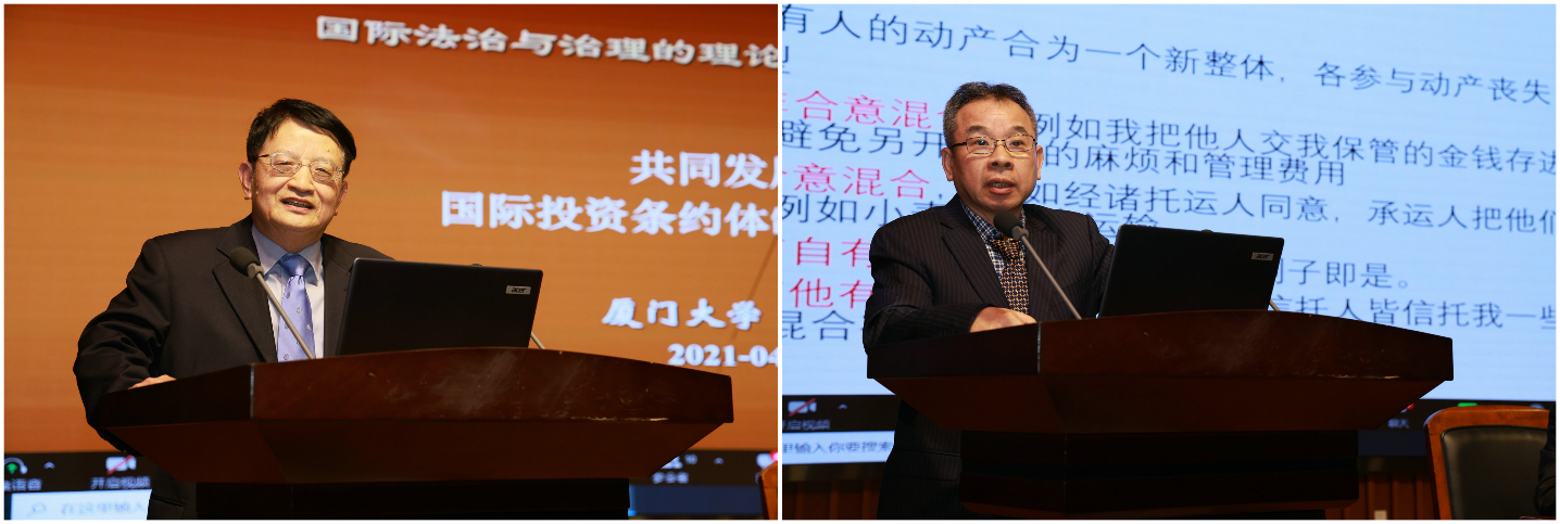 厦门大学法学院教授、中国国际经济法学会会长曾华群教授简述了传统双边投资条约实践目标的演进路线与实质。厦门大学法学院教授、中国外国法制史研究会副会长徐国栋围绕“跨国法关于混合的规定、其罗马法起源、比较法考察和中国适用”发表了讲话。他以混合的概念与类型为引,列举了大陆法与英美法对于混合归属的不同规则,并介绍了采用混合追踪规则的司法状况。