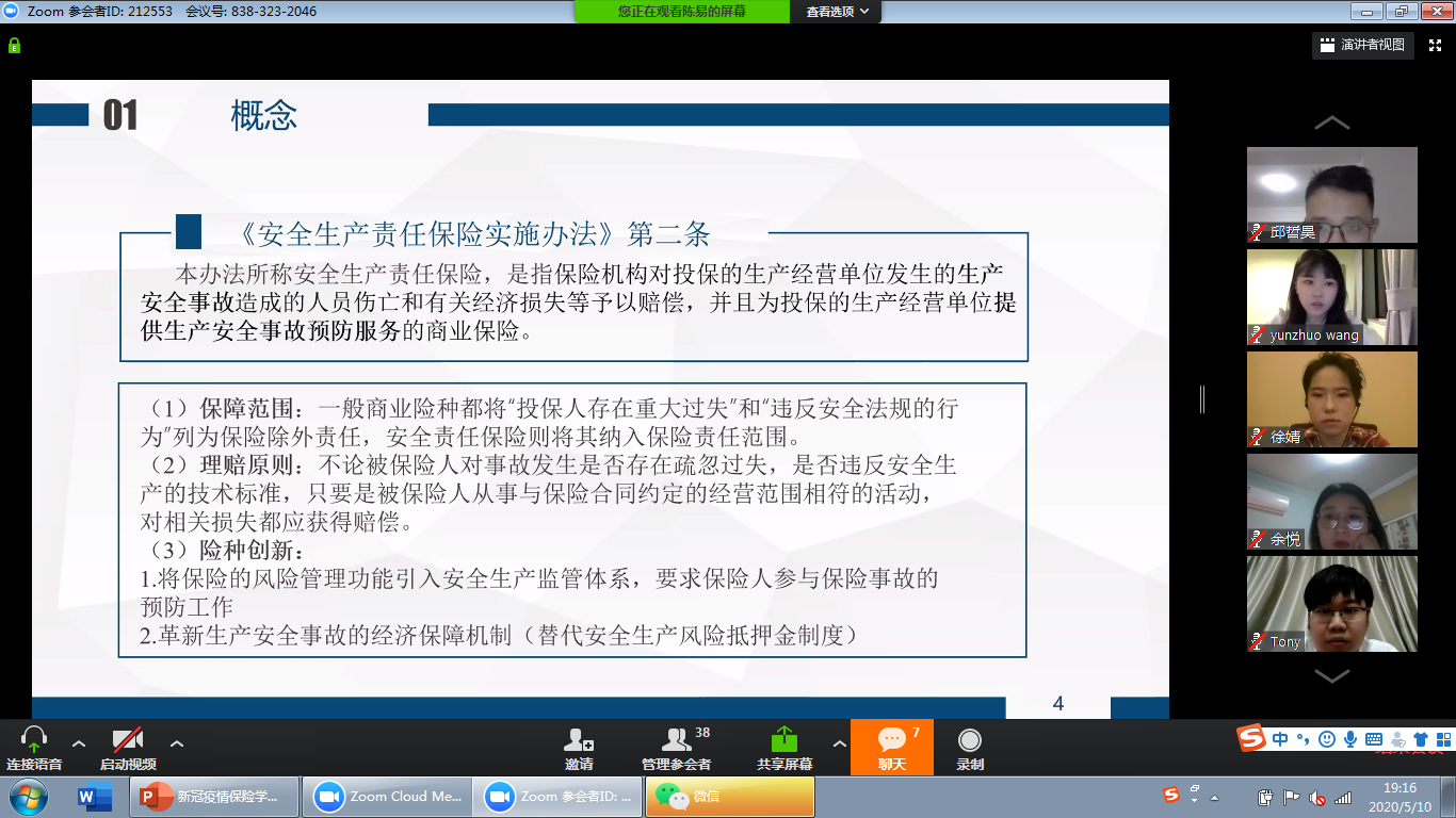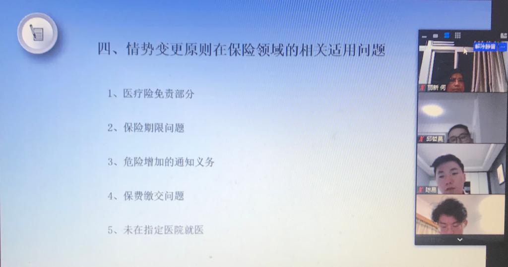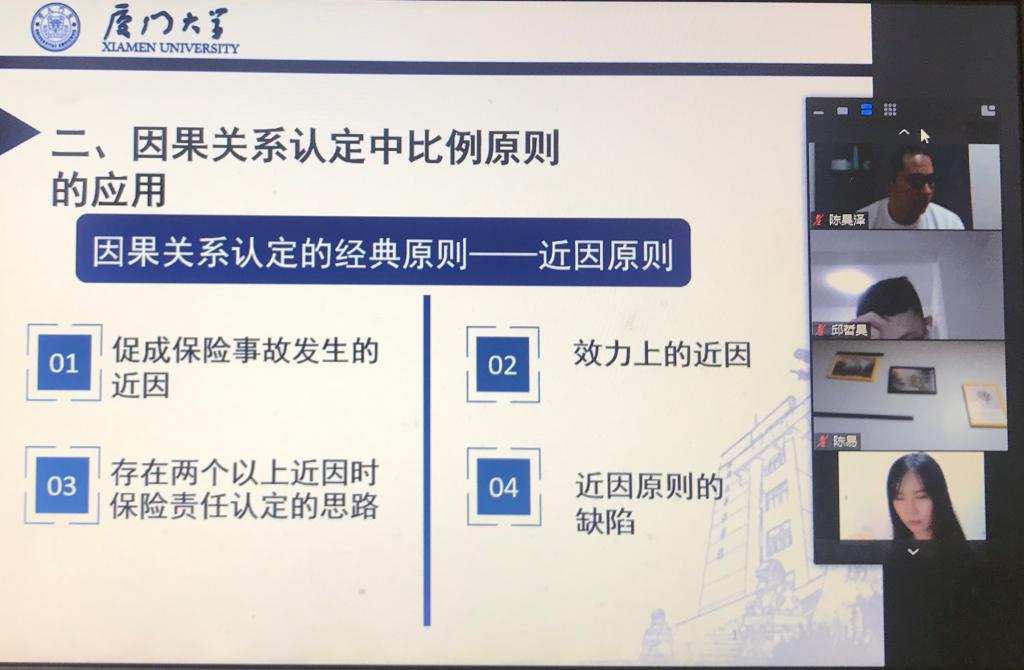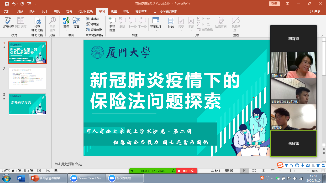5月10日晚7时,厦门大学法学院通过ZOOM视频平台成功举办了第二次网络学术沙龙活动,主题为《新冠肺炎疫情下的保险法问题探索》。本次沙龙群贤毕至,少长咸集,活动由何丽新教授主持,陈易、邱哲昊、陈泽平、余悦、郑乃荣、胡霖琦、王玥明、李玲玉、朱欣蕾、徐婧、陈诺等同学作课题报告,会议还邀请了大连海事大学的邢厚群博士、厦门大学经济学院的赵正堂副教授与厦门大学法学院的阎语博士后参与,亦有不同年段的本科生、硕士、博士共同讨论。