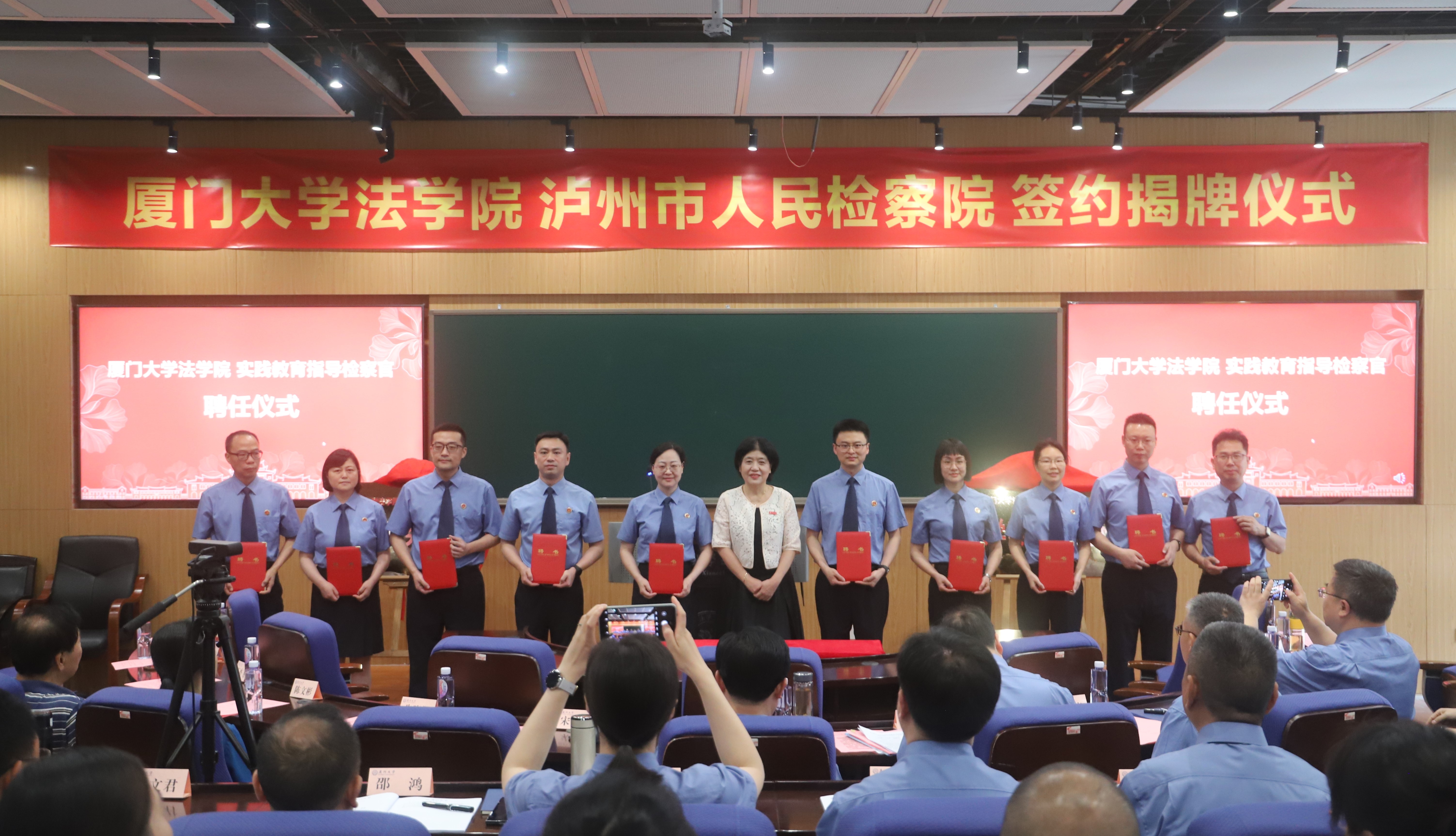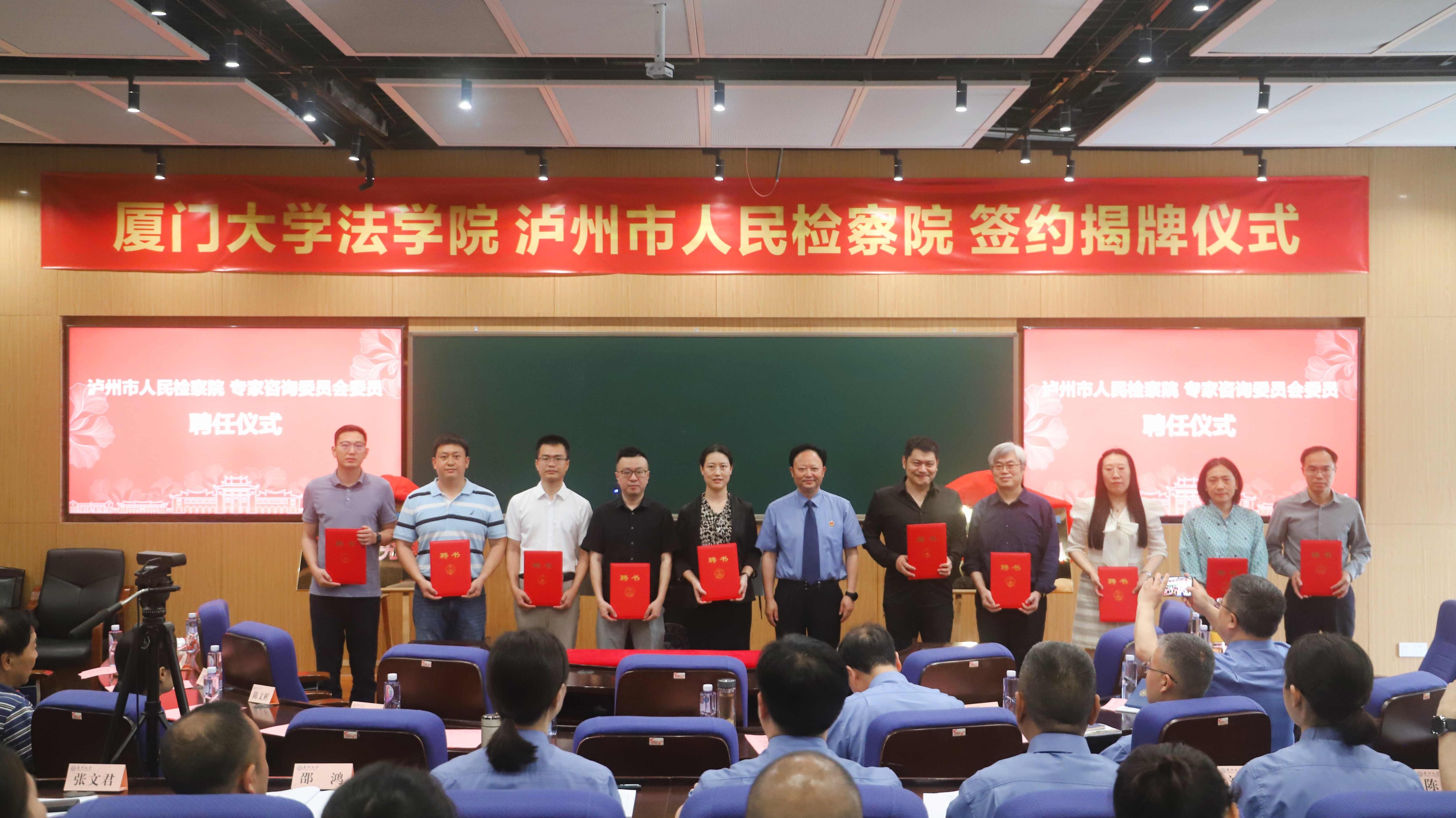 根据双方检校合作协议,泸州市人民检察院聘请厦门大学法学院十名学科专家担任泸州检察系统“专家咨询委员会委员”,刘孝勇检察长为受聘专家颁发聘书。厦门大学法学院聘请泸州检察系统十名检察官担任厦门大学法学院“实践教育指导检察官”,宋方青院长为受聘检察官颁发聘书。