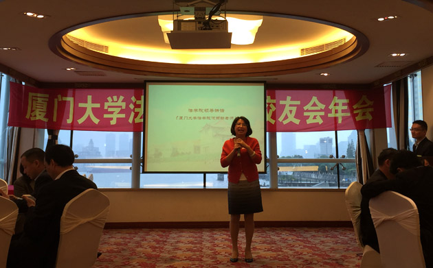 厦门大学法学院副院长何丽新则从学科建设、人才培养、社会服务三个方面汇报了厦门大学法学院取得的成就。何副院长还就明年将举办的法学学科90周年活动向在座校友发出邀请,并倡议全国校友对如何办好法学学科90周年庆祝活动积极建言献策。