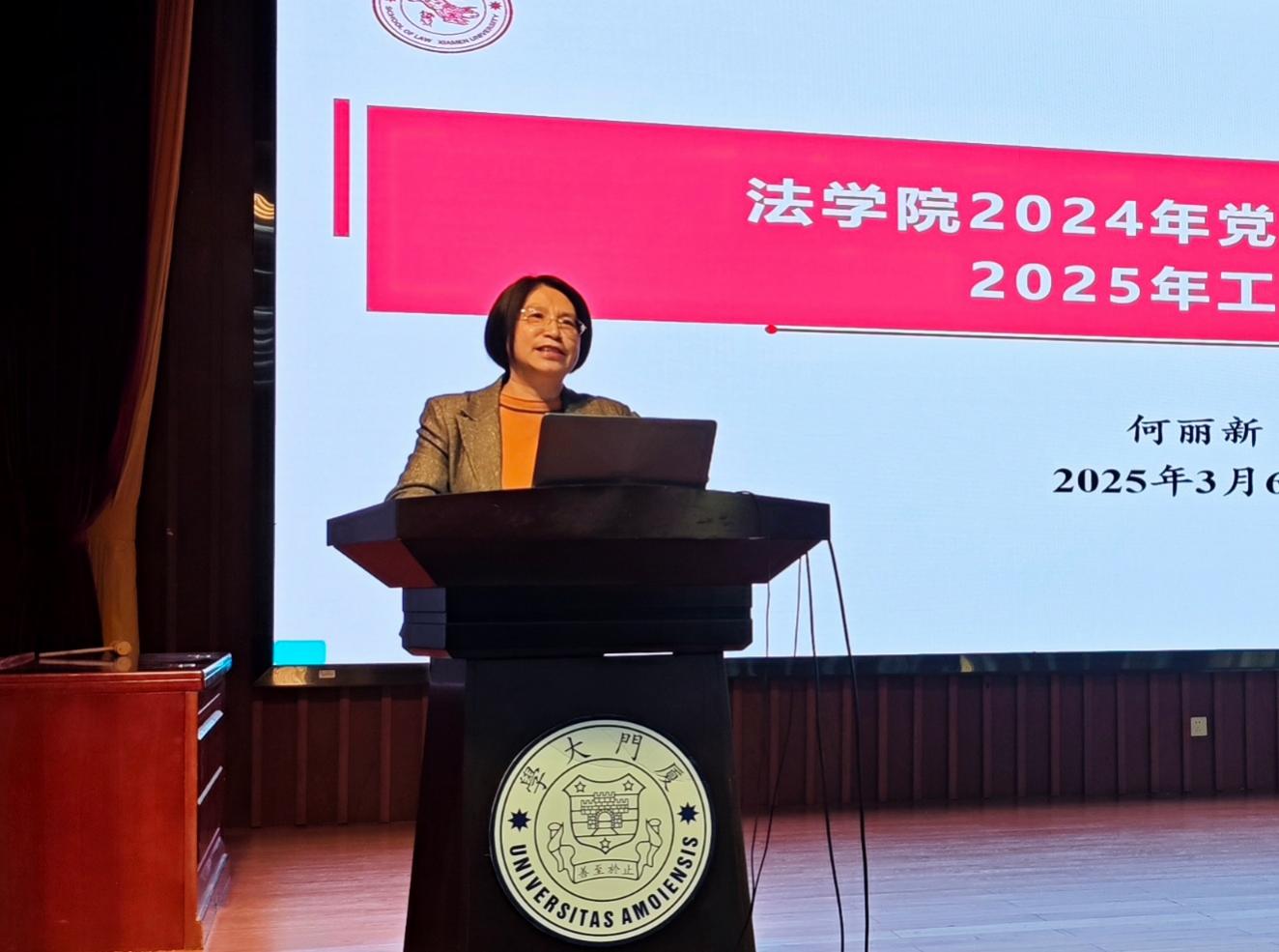 何丽新书记作法学院2024年度党建工作总结及2025年度党建工作要点报告。报告从组织建设、理论武装、队伍建设、价值引领、学科特色、宣传引导等六个维度展开,对学院党委上一年度开展的工作进行总结,提出2025年度党委工作要点。何丽新书记还传达了全校工作布置会精神,号召全体教职工提高站位,以法学院主人翁的姿态积极投身学院各项工作,为迎接法学学科百年华诞做出新的更大贡献。