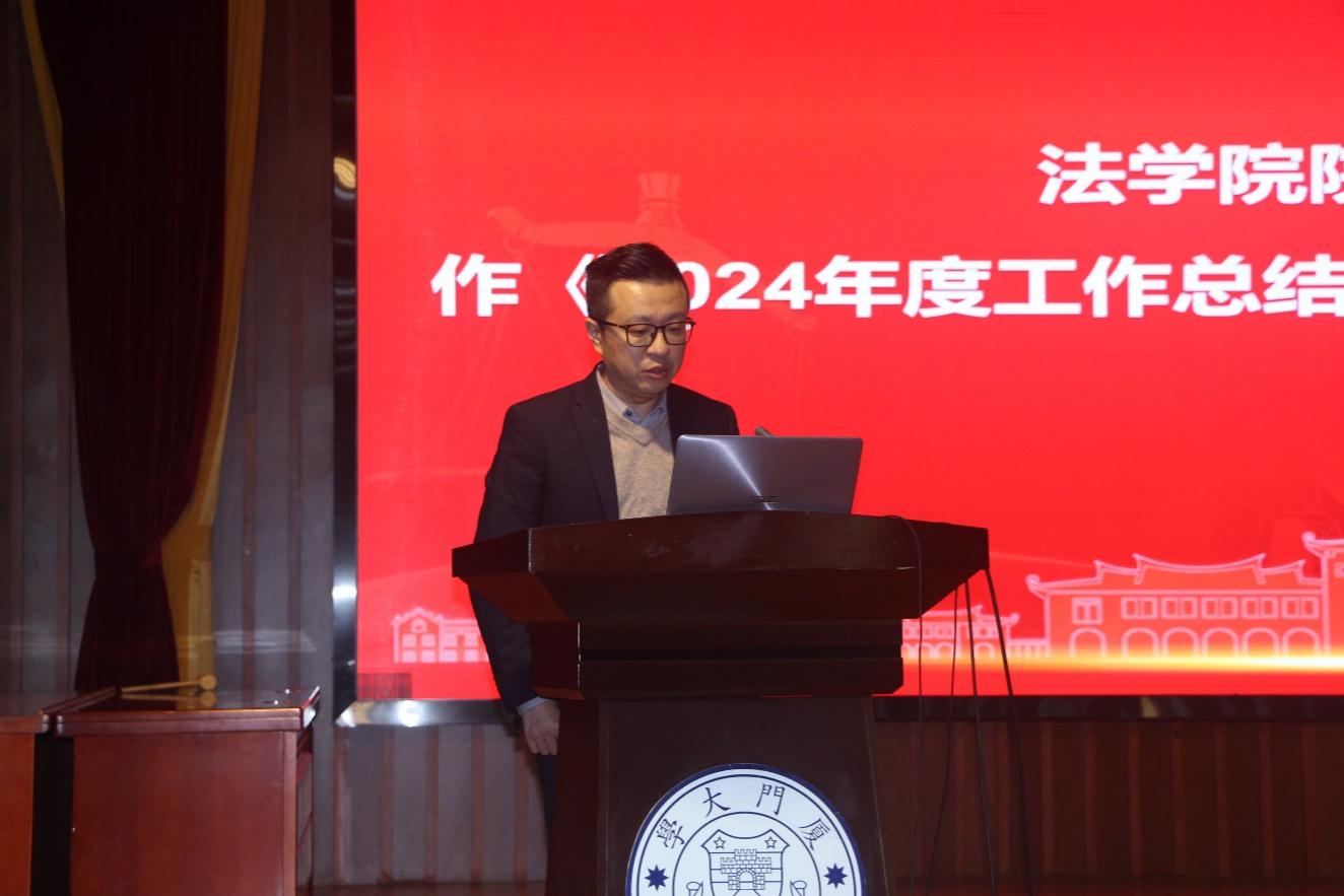 陈鹏院长作法学院2024年度工作总结及2025年度工作计划报告。陈鹏从人才培养、科学研究、对外交流、后勤保障等方面对学院上一年度工作进行总结,并传达了学校工作布置会的工作要点,同时对学院新学期工作进行布置。