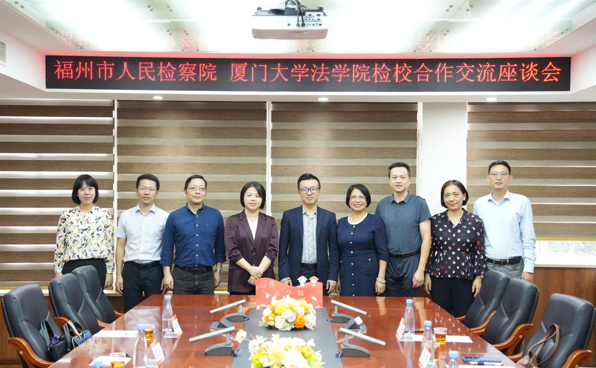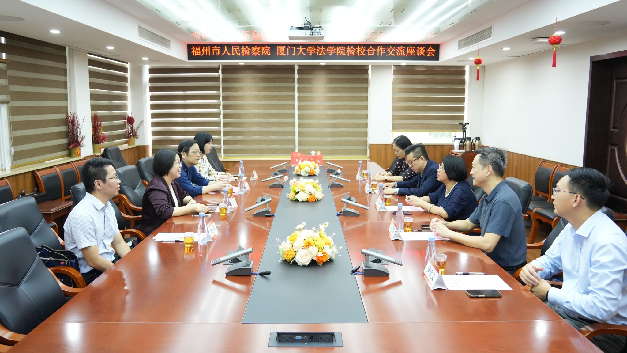 10月31日上午,福州市人民检察院党组书记、检察长江莉,党组成员、副检察长陈喆,宣教处处长周丕驱,办公室副主任林晶一行来院推进检校合作,法学院党委书记何丽新、院长陈鹏、党委副书记张宇斌、诉讼法教研室主任刘学敏教授、刑法教研室熊亚文副教授接待来访,双方在C220会议室座谈交流。