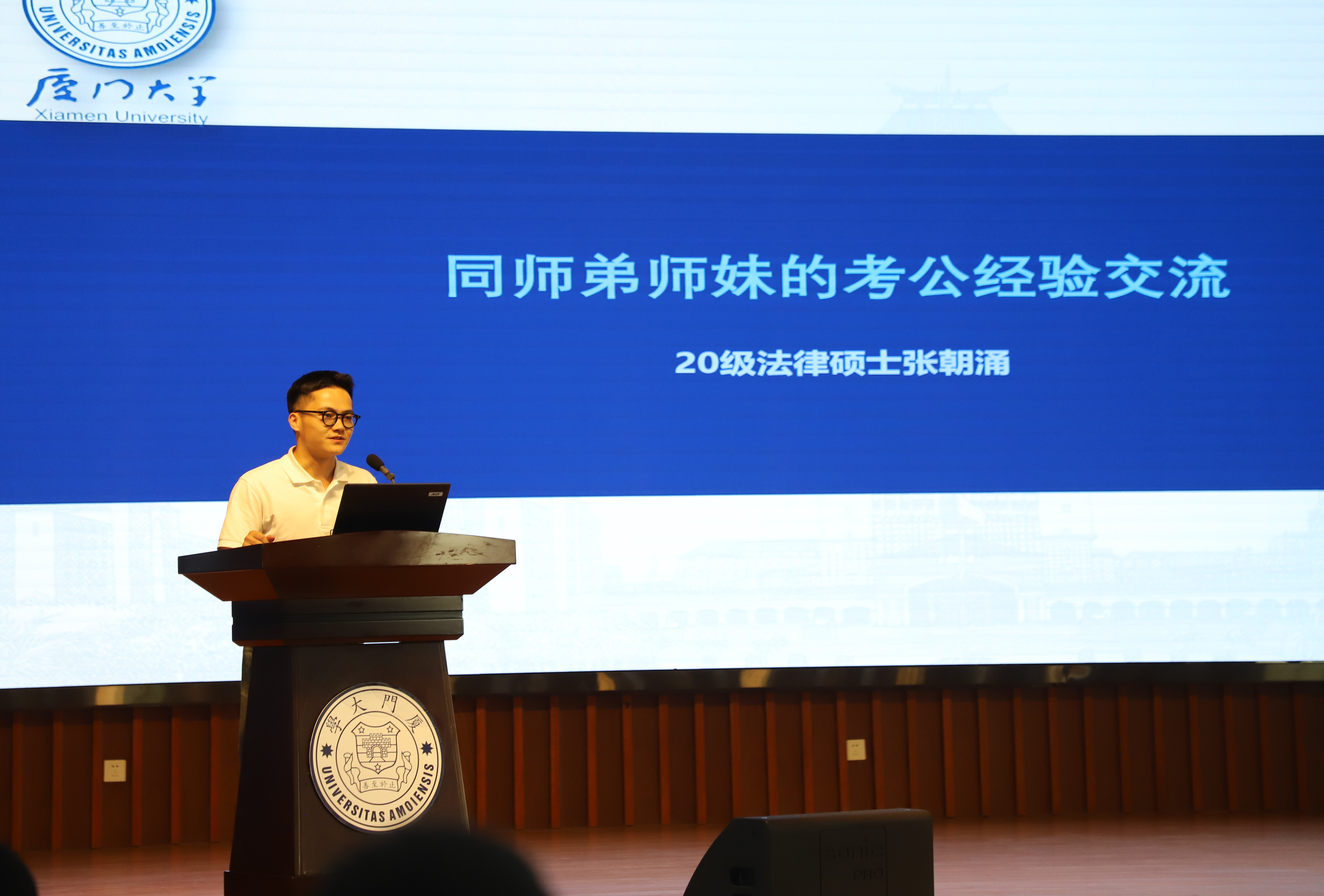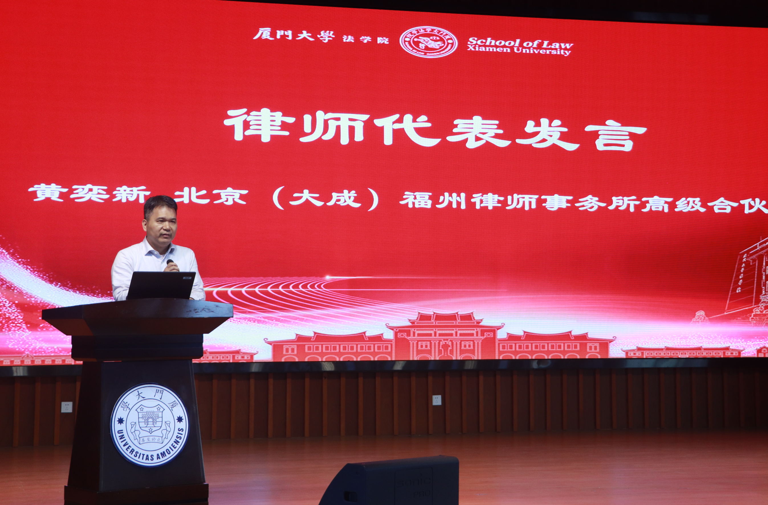 北京大成(福州)律师事务所高级合伙人、法学院1997届院友黄奕新以自身丰富的职业生涯为例进行发言。他强调法学生应当对自己选择的法律专业有信心,扎实的法律专业知识是法学生的立身之本。律师职业是医治社会机体疾病、维护公平正义的神圣职业,希望大家都能增强对律师工作的认同感,在以后的执业过程中恪守职责、勇担使命,最终完成自我价值的实现。