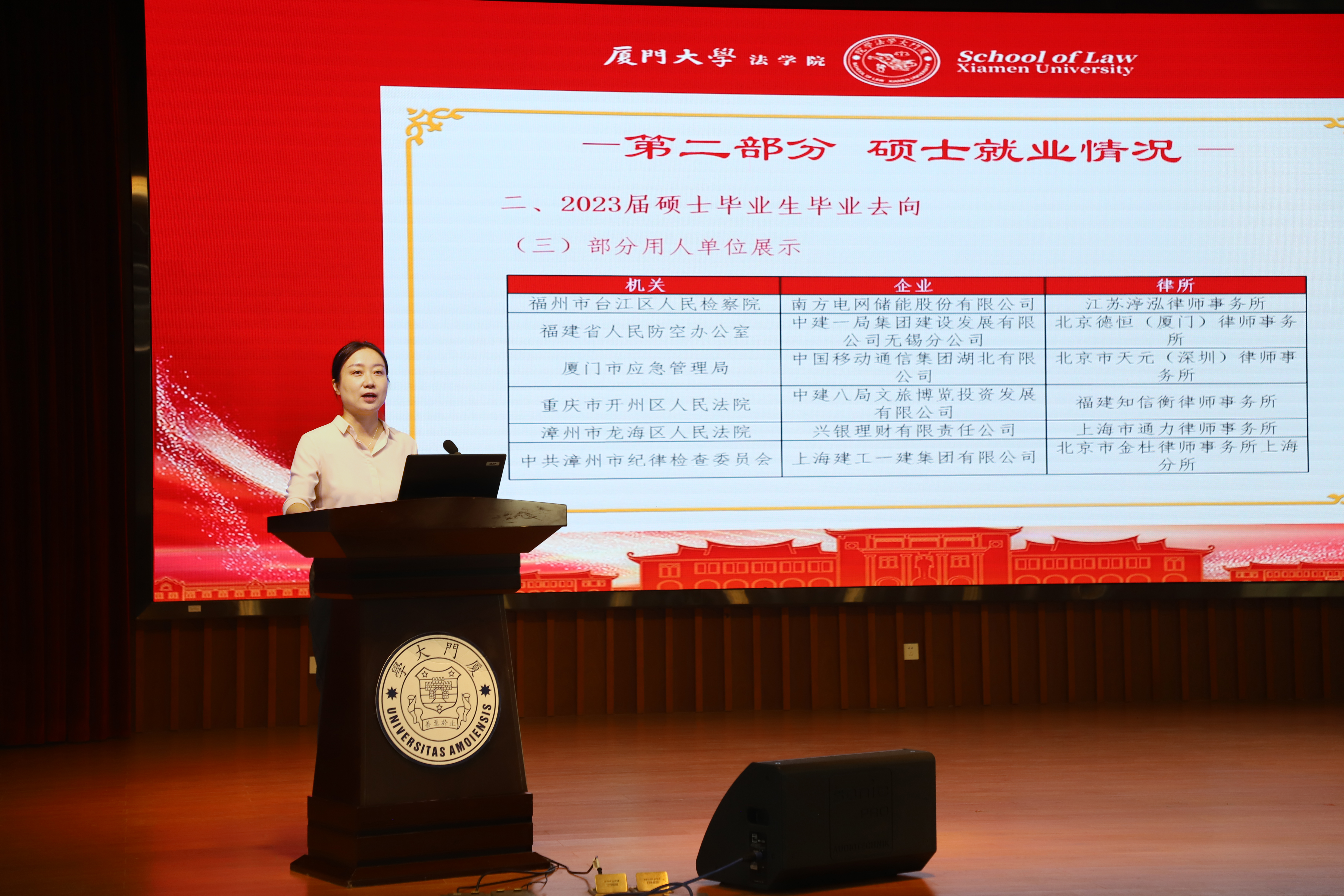 为深入贯彻党中央、国务院提出的关于稳就业、促就业的有关要求,提高学院就业指导工作的精准度,帮助学生树立正确就业观念、认清就业形势、把握就业机会,10月26日,法学院在模拟法庭召开2024届毕业生就业动员大会。院党委书记何丽新教授作动员讲话。会议特别邀请了厦门国贸集团、北京大成(福州)律师事务所等单位院友到会开展就业指导、生涯规划和经验分享。