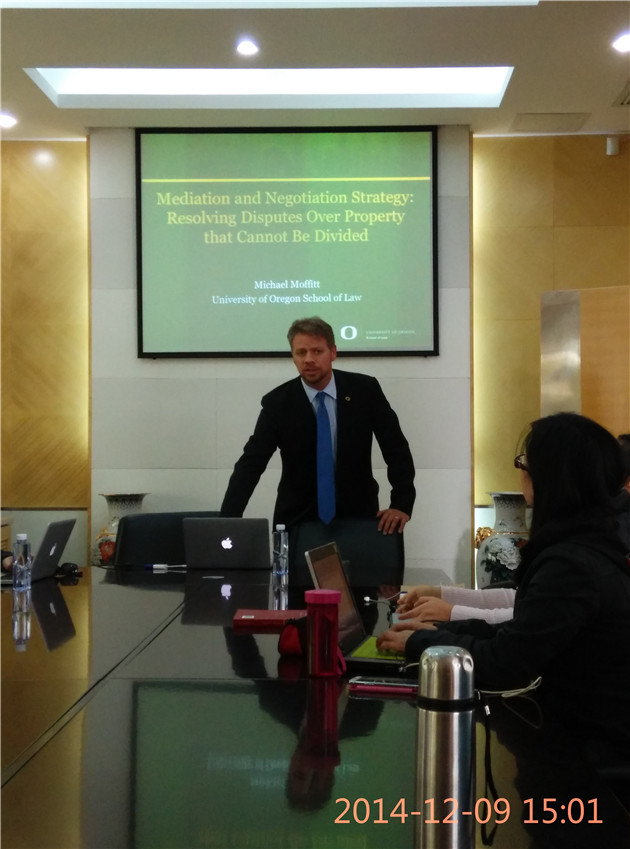 2014年12月9日下午3点,在我院C519举行了主题为《调解、谈判和法律策略:解决不可分割财产纠纷》的讲座。此次讲座的主讲人是俄勒冈法学院院长Michael Moffitt教授。他任职于联邦司法书记员职务,在并致力于为全球二十多个国家的谈判和解决项目提供咨询工作。