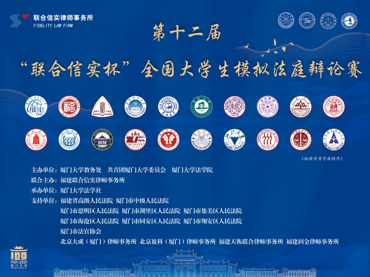 2021年5月1日至5月3日,第十二届“联合信实杯”全国大学生模拟法庭辩论赛在法学院举办。此次比赛由厦门大学教务处、共青团厦门大学委员会、厦门大学法学院主办,福建联合信实律师事务所联合主办,厦门大学法学社承办。活动吸引了来自对外经济贸易大学、福州大学、华东政法大学、华南理工大学、吉林大学、暨南大学、清华大学、山东大学、上海财经大学、四川大学、同济大学、武汉大学、西北政法大学、西南政法大学、厦门大学、浙江大学、中国人民大学、中南财经政法大学的全国18所高等院校的优秀法学学子参与。
