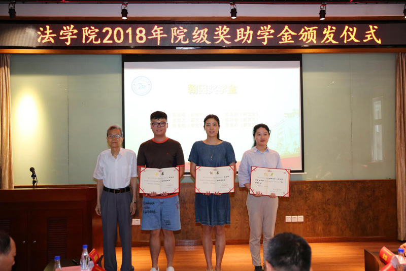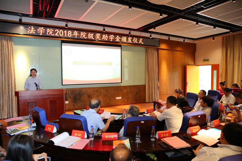 5月31日下午,厦门大学法学院2018年院级奖助学金颁发仪式于在法学院B138召开。出席本次仪式的嘉宾有陈安教授,曾华群教授,齐树洁教授,福建旭丰律师事务所党总支书记方磊,福建旭丰律师事务所主任王桂英,法学院本科1989级校友、工商银行思北支行副行长廖卫红,中国人民财产保险股份有限公司厦门分公司理赔事业部、法律部总经理邓小荣,福建拓维律师事务所首席合伙人许永东,福建拓维律师事务所律师胡春芳,法学院2001级民商法硕士、校友查达来,北京观韬中茂(厦门)律师事务所执行主任李焰盛、执行合伙人安寿志、朱玥、北京大成(厦门)律师事务所高级合伙人张贵茂,法学院党委书记李智勇、法学院党委副书记张伟、法学院副院长李国安教授;以及法学院师生代表、获奖和受资助学生代表。仪式由法学院党委副书记郭锦星主持。