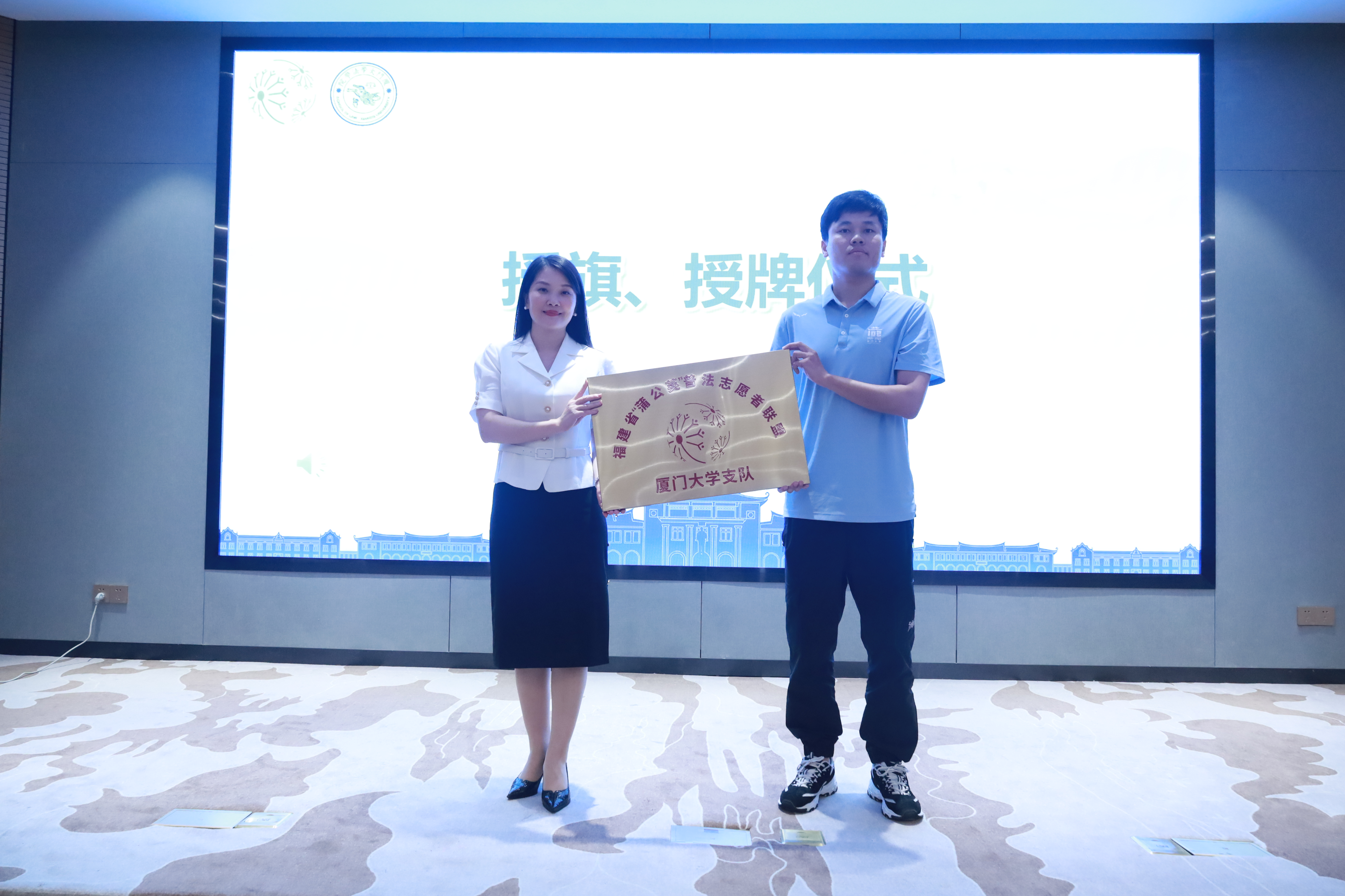 仪式上,林德明、林晓霞分别向“蒲公英”普法志愿者联盟厦门大学支队授旗、授牌。