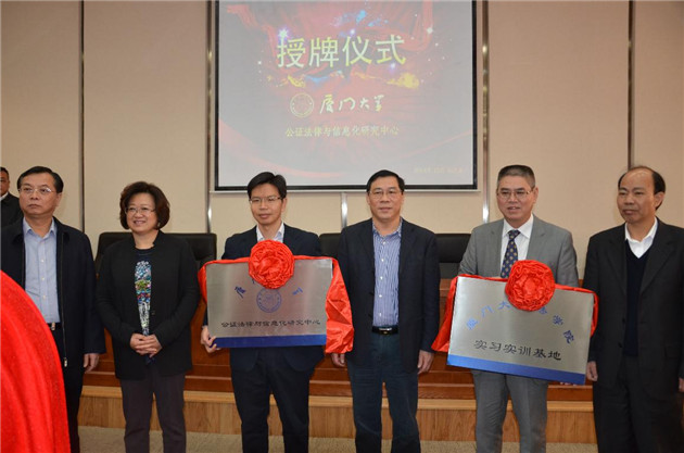 紧接着,李智勇书记宣布启动授牌仪式,由王敏夫副厅长、叶勇义局长、丁露会长、苏国强主任等共同向厦门大学授牌,厦门大学公证法律与信息化研究中心正式成立。