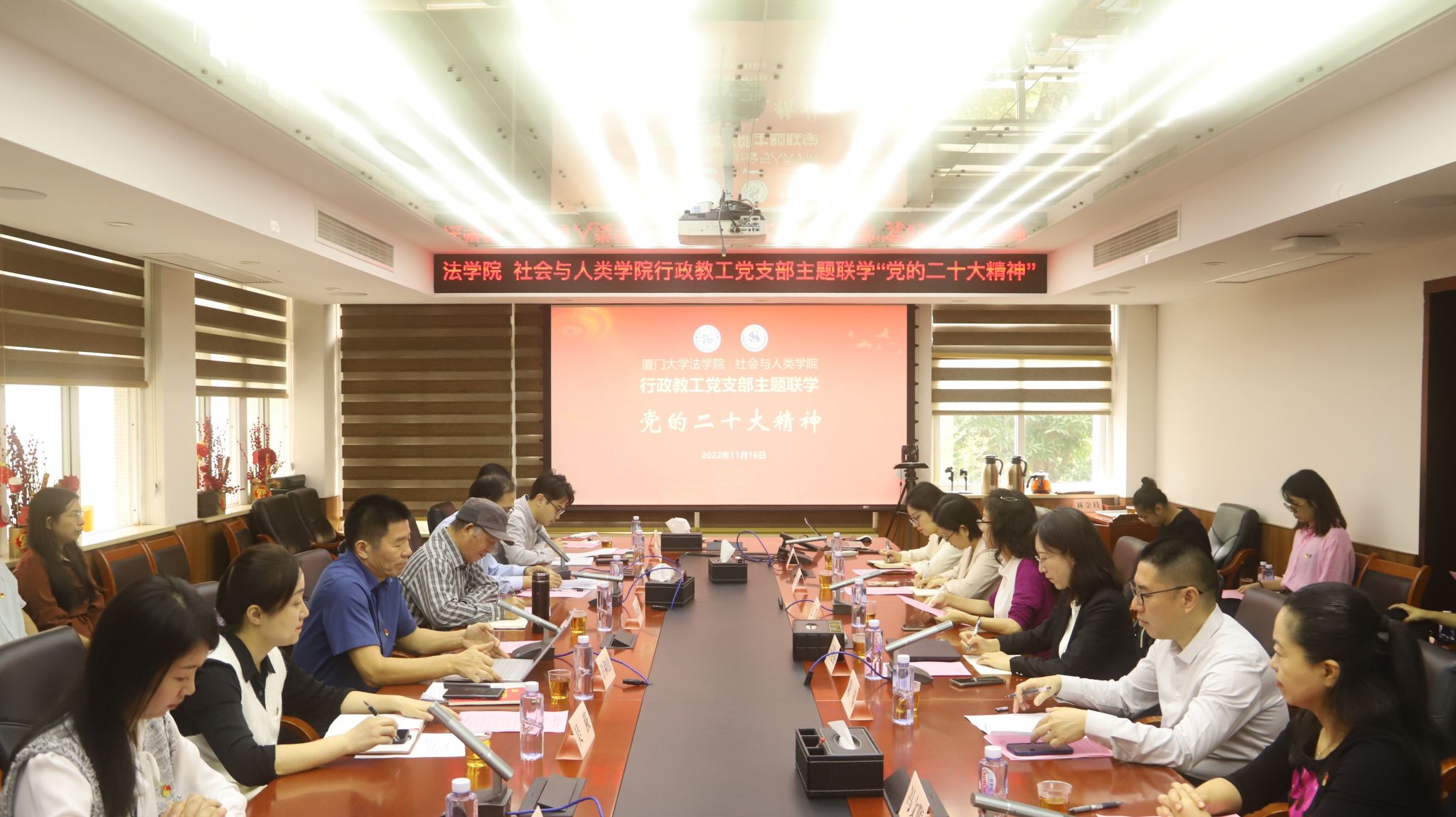 为深入学习宣传贯彻党的二十大精神,11月16日上午,法学院、社会与人类学院组织召开行政教工党支部联学会,共同学习党的二十大精神。厦门大学基层党建工作联络员林永生出席指导。法学院党委书记许和山、副书记郭锦星、副书记吴荻,社会与人类学院党委书记王晓丽、副书记陈夷、副书记毛毛、副院长冯文晖以及两院行政教工党支部成员参加会议。会议由两位党支部书记郭锦星和陈夷共同主持。