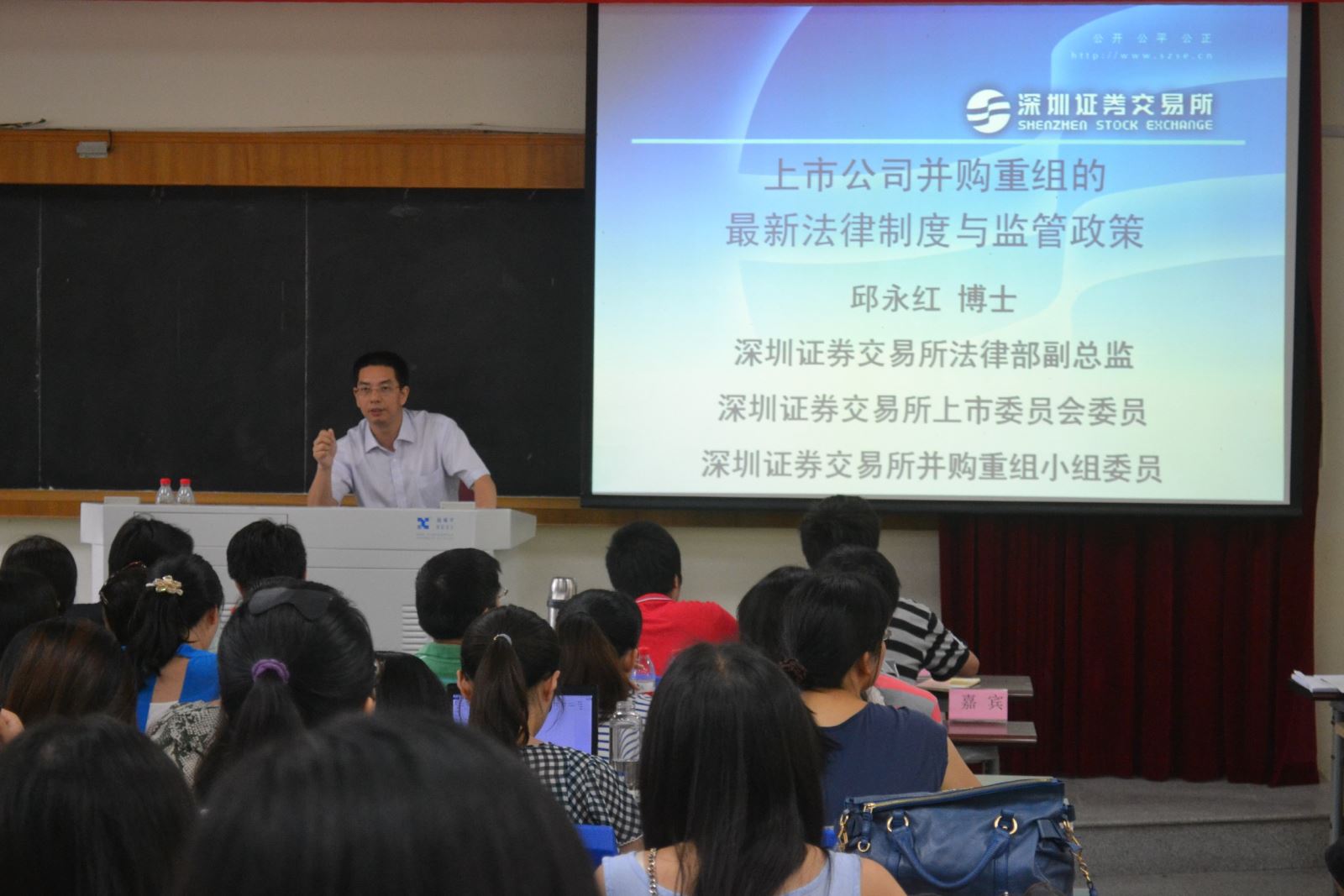厦门大学历来被誉为“金融界的黄埔军校”,厦大法学院多年以来为金融证券行业输送了大量人才,其中不乏业内的佼佼者,为了加强在校学生对证券行业的了解,进行职业选择,规划事业人生,厦门大学法学院特组织了杰出校友证券法系列讲座,邀请知名校友分享证券法领域的研究成果和工作经验。2014年6月14日上午9:00,在法学院137教室成功举办了首场讲座。本场讲座邀请到了厦门大学法学院国际经济法专业1996级硕士,2001级博士邱永红,邱永红校友现任深圳证券交易所上市委员会委员、法律部副总监,并兼任中国证券法学研究会常务理事、中国国际经济法学会理事、广东省金融法学会常务理事、厦门大学客座研究员、深圳市政府法律专家咨询委员会委员、中国国际经贸仲裁委员会华南分会仲裁员、调解专家等重要社会职务。讲座会场聚集了我校法学院、经济学院以及管理学院的师生,还有许多律师、上市公司的董事会秘书等慕名而来,场内座无虚席,盛况空前。