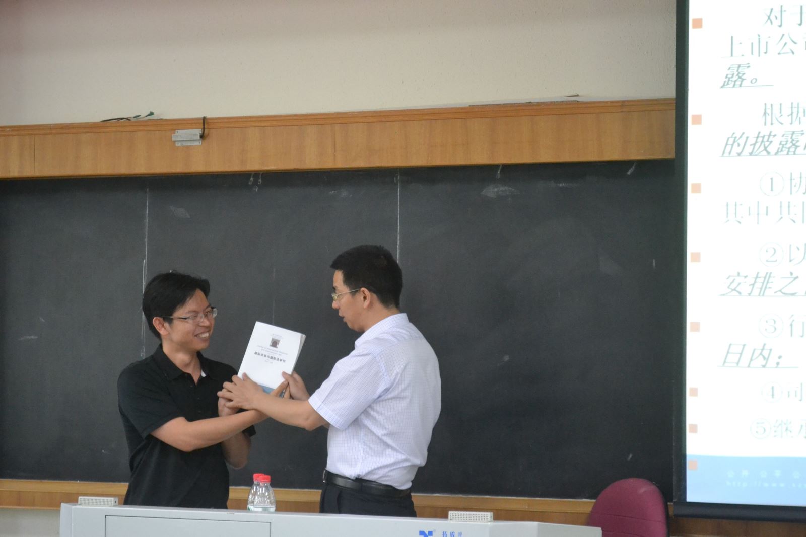 在讲座结束之时,分别由法学院刘志云老师以及肖伟老师进行点评,两位老师均对本场讲座作出了高度评价,法学院副院长何丽新老师也向邱永红校友赠出水晶独角兽,表达了校友之间的隽永友谊以及对杰出校友的深刻谢意。讲座在观众经久不息的掌声圆满结束。扎实理论、接轨实践,是我校培养厚基础、宽口径法学人才的办学宗旨的题中之义,作为法学学生了解实务界动态、吸收课本外知识对于未来职业选择,甚至是人生规划都是大有裨益的。 相信在场师生以及证券工作职业者在本场讲座中都受益匪浅,也让我们期待法学院杰出校友证券法系列讲座越办越好!