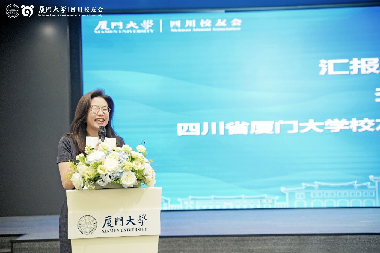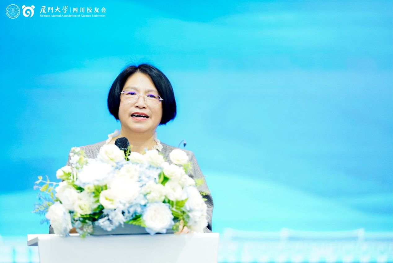 何丽新在发言中报告法学院建设与发展情况。她提出,法学分会成立标志着厦大法学在四川影响力进一步提升,并表示学院未来将加强与四川法学校友联动,支持西部法治人才培养,同时邀请广大四川法学校友明年相约回到母院,共同见证厦大法学学科百年盛典。