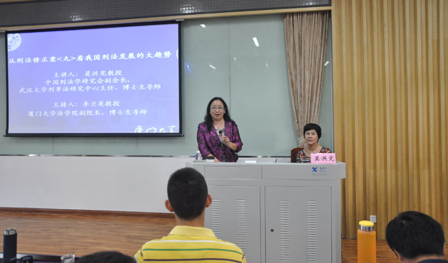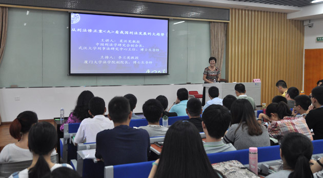 金秋十月的厦门阳光恬静,柔风和煦,送走国庆长假的络绎宾客,厦门大学法学院又迎来一场不同凡响的学术盛宴。10月8日的下午三点,中国刑法学研究会副会长、武汉大学刑事法研究中心主任莫洪宪教授应厦门大学经济犯罪研究中心的邀请,在法学院137报告厅为法学院学子带来了一场题为“从《刑法修正案(九)》看我国刑法发展的大趋势”的学术讲座。厦门大学法学院副院长、博士生导师李兰英教授出席并主持本次讲座,刑法教研室全体教师、博士生、硕士生参与并聆听了讲座。同学们的积极参与使得会场内座无虚席,盛况空前。