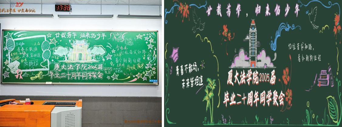 活动伊始,校友们按照3个班级分聚当年上课的教室。一方熟悉的黑板成为情感载体,粉笔绘就“时光黑板报”。“廿载芳华,归来仍少年”的鲜亮标题下,巍峨的建南大会堂、高耸的颂恩楼、书籍卷轴和学位帽等跃然板上,旁边是一个个熟稔于心的签名,瞬间将校友们的记忆拉回风华正茂的求学岁月。