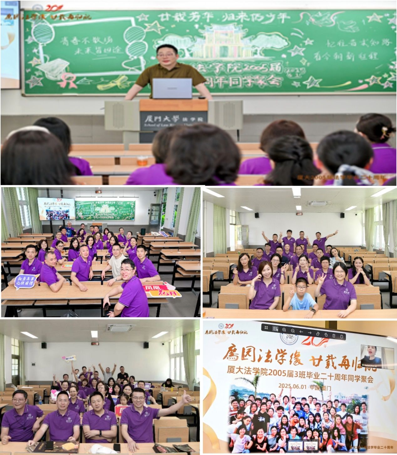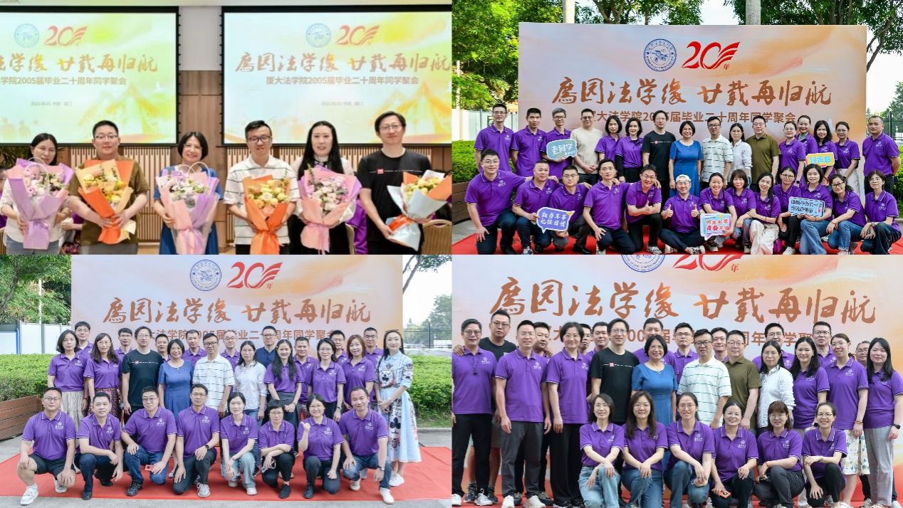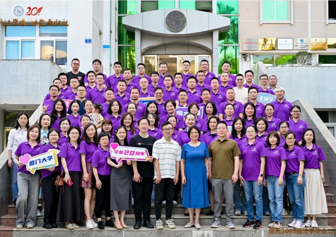 2025年6月1日,凤凰花开的时节,法学院2001级本科校友,犹如二十年前般意气风发,身着紫衣重返母校,举行毕业20周年返校活动,展开了一场充满温情与敬意的精神归航。法学院党委书记何丽新、院长陈鹏,当年的班主任和辅导员孙丽岩、李晓龙、高斌,校友工作秘书刘巧英等应邀参加活动。