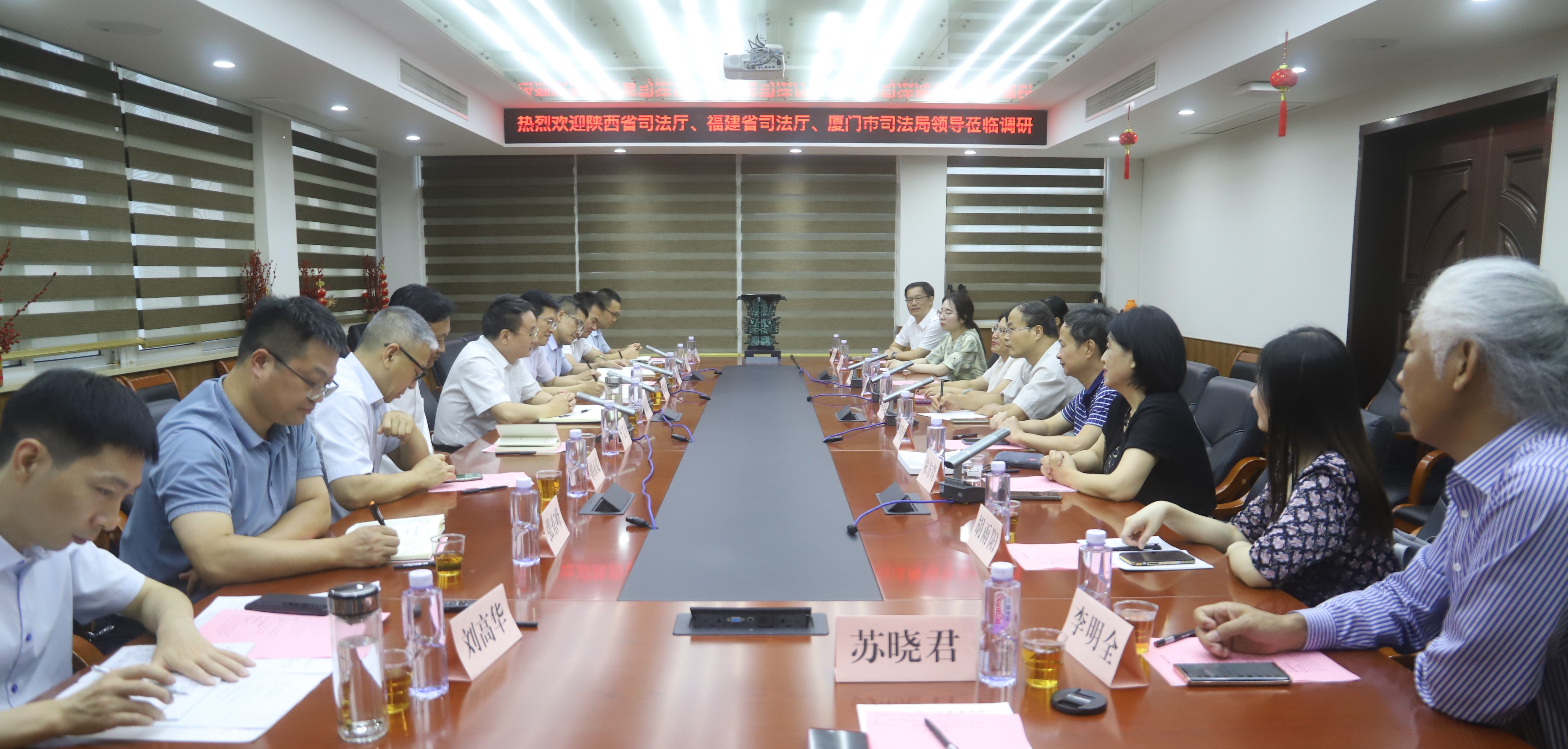 8月7日下午,陕西省司法厅党组书记、厅长杨政国,陕西省司法厅副厅长李艾平、郝茂成,陕西省律师协会会长韩永安,西安市司法局局长苏国峰,陕西省司法厅政府法律事务处处长张东峰,陕西省司法厅律师工作处处长宗银川等一行人,以及福建省司法厅党委副书记、副厅长林安泰,厦门市司法局副局长李明哲等领导莅临我院,在220会议室开展调研座谈。