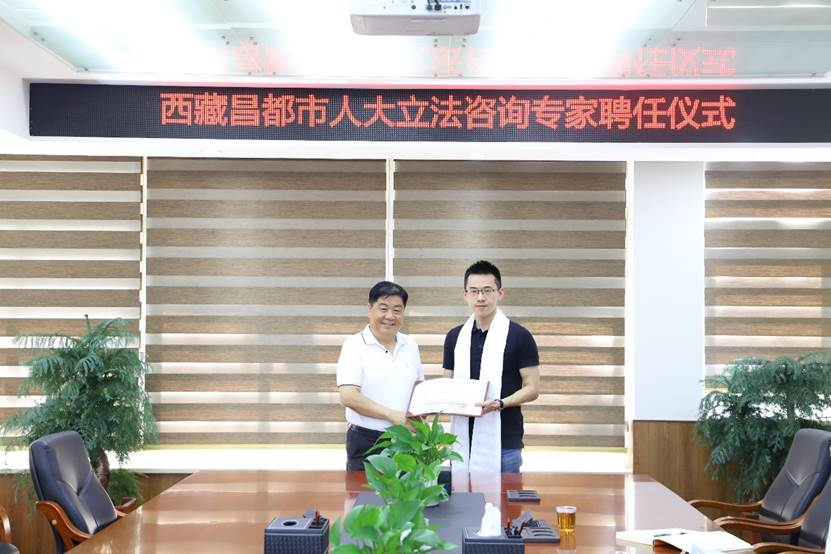 宋方青院长与王翔助理教授受聘成为西藏昌都市人大立法咨询专家,齐飞副主任为两位专家献上表达敬意的洁白的哈达并颁发聘书。