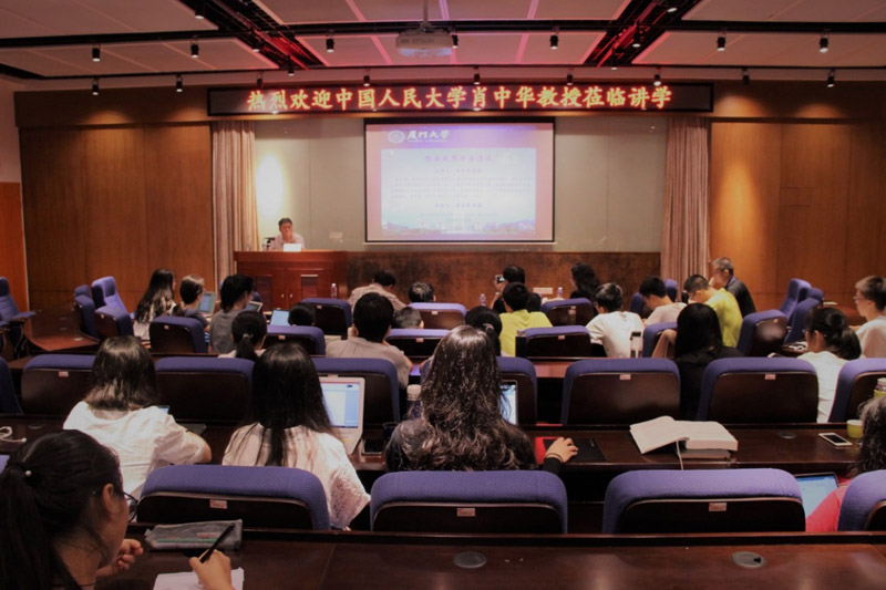 2018年7月7日星期六的晚上,在厦大法学院138教室,正在进行着一场“刑法适用方法漫谈”的学术讲座。主讲嘉宾是中国人民大学法学院博士生导师肖中华教授,主持人是厦大法学院李兰英教授。法学院的郑金火、李晓龙、刘炯、汪东升、王宗涛等教师以及法学院本硕博各年级的几十名学生前来聆听和交流。