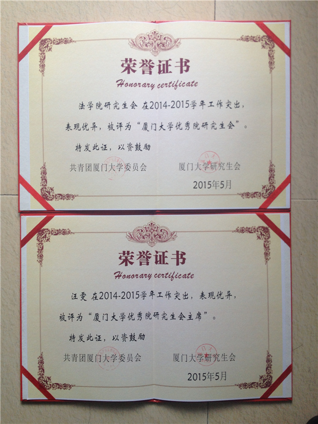 5月24日上午9:00,厦门大学第二十五次研究生代表大会在思明校区法学院模拟法庭顺利召开。大会上,厦门大学校团委评选出2014-2015学年厦门大学优秀院研究生分会、优秀研究生分会主席,本次参评的共有经济学院、管理学院、公共事务学院、人文学院、法学院等15个学院,我院研究生会以卓越的表现脱颖而出,获得厦门大学优秀研究生分会称号,研究生会主席汪雯同学获优秀研究生分会主席荣誉称号。