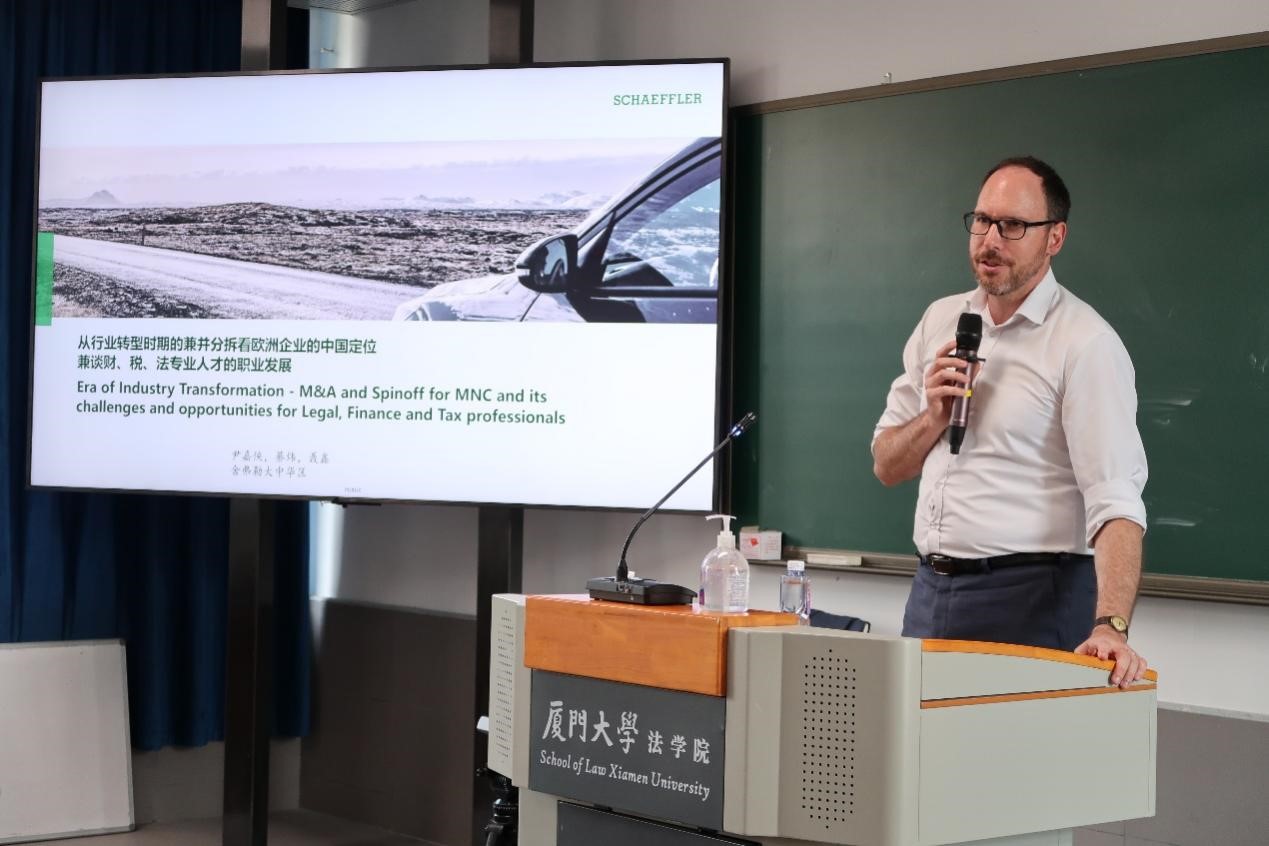座谈会上,学院党委副书记张宇斌介绍了本次讲座的安排、主题内容以及三位主讲人。首先,舍弗勒大中华区首席财务官尹嘉侠从主营范围、营收情况、员工数量等方面介绍了舍弗勒集团。舍弗勒在汽车、铁路、航空、工业自动化等领域深耕多年,然而随着全球市场的快速发展和跨境经营的日益复杂,企业分拆已成为跨国公司释放价值、提高运营效率和应对市场动态的战略工具。他举例介绍了舍弗勒集团收购Vitesco的企业并购业务,希望通过并购发挥协同作用,应对电车对传统油车市场造成的冲击。