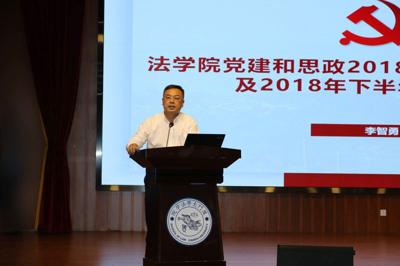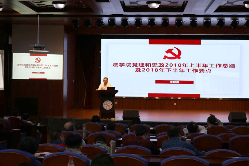 李智勇书记代表法学院党委作上半年工作总结报告和下半年工作计划。他从两个方面总结了法学院党建和思政2018年上半年工作:一是全面推进党的建设,深入学习贯彻习近平新时代中国特色社会主义思想和党的十九大精神,加强党的政治建设、干部队伍建设和工青妇等群众团体建设;二是做好思政教育工作,制定实施《法学院班主任工作条例》、组织学习《一流本科教育宣言(成都宣言)》、《教育部关于全面落实研究生导师立德树人职责的意见》、做好学生思政工作,召开专题组织生活会共计19场,党规党纪学生研习社成功举办“党规党纪印我心”社区宣传活动;各团支部开展“强国一代的使命与担当”团日活动;举行2018届毕业生廉政教育大会;加强舆论宣传管理,健全网站信息内容更新的保障机制,为进一步提升法学院的宣传工作,扩大法学院的影响力。