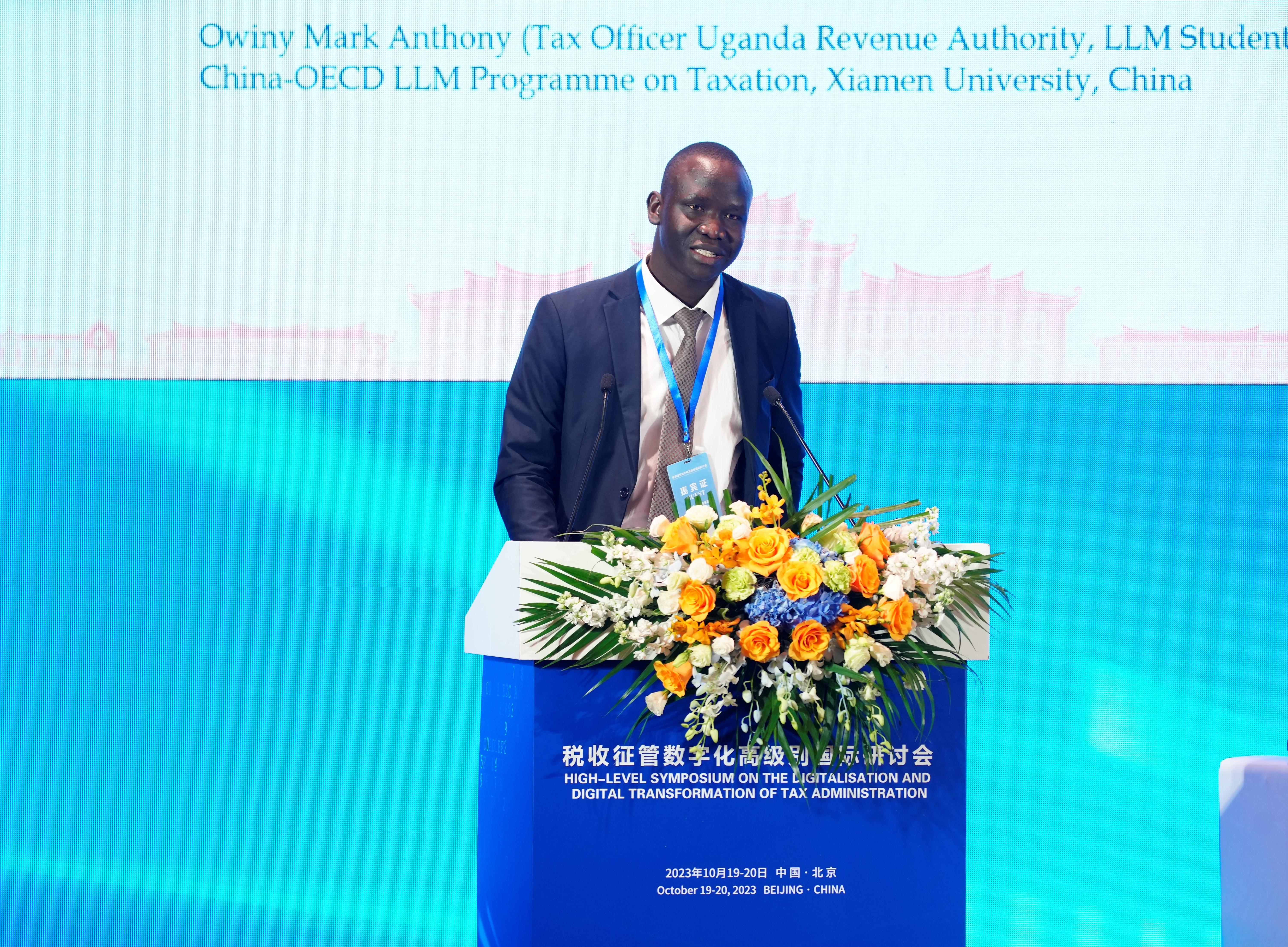 在此次研讨会上,奥维尼·马克·安东尼针对议题一“电子发票”以东非国家乌干达和坦桑尼亚为例做了精彩的主题发言,分享电子发票在提升乌干达和坦桑尼亚税收征管数字化水平方面的重要作用,并与格鲁吉亚税务局国际关系司司长萨姆森·乌里迪亚、塞拉利昂国家税务总局主席玛·阿达玛·亨托·卡马拉、韩国国税厅副局长朴宰亨等重要嘉宾就电子发票在各国的实践经验、存在问题和解决方法进行了深入交流和探讨。孔巴·斯黛拉在研讨会期间接受了中央广播电视总台采访,就在厦门大学进行联合培养项目学习体会、参会感受等问题与记者进行讨论。她表示,非常感谢能进入联合培养项目学习并获得参加此次高级别研讨会的机会,她将带着在中国学到的宝贵知识和经验回国,为自己国家的税收征管体系发展和促进与中国税收领域合作作出积极贡献。